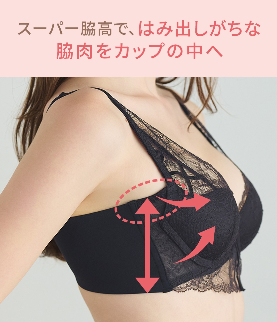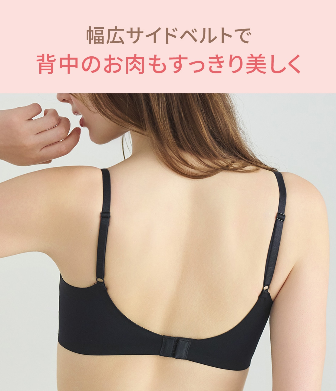 ・ワイヤー上端を超えるスーパー脇高のサイドベルトが、はみ出しがちな脇肉をやさしくカバー。段差を抑え、背中まですっきりスムーズに整える。