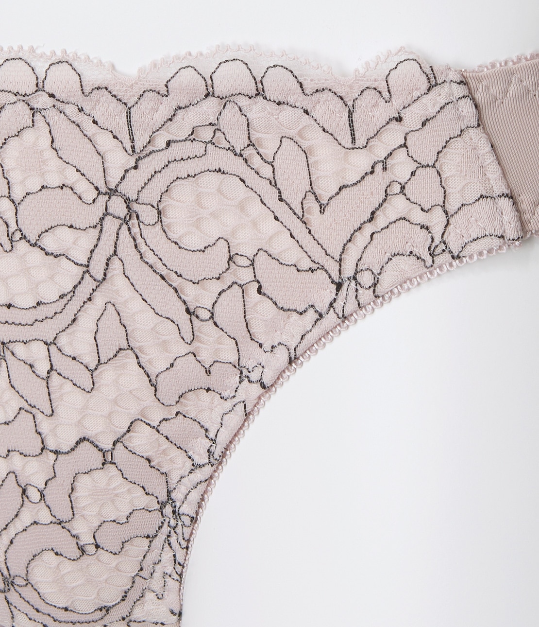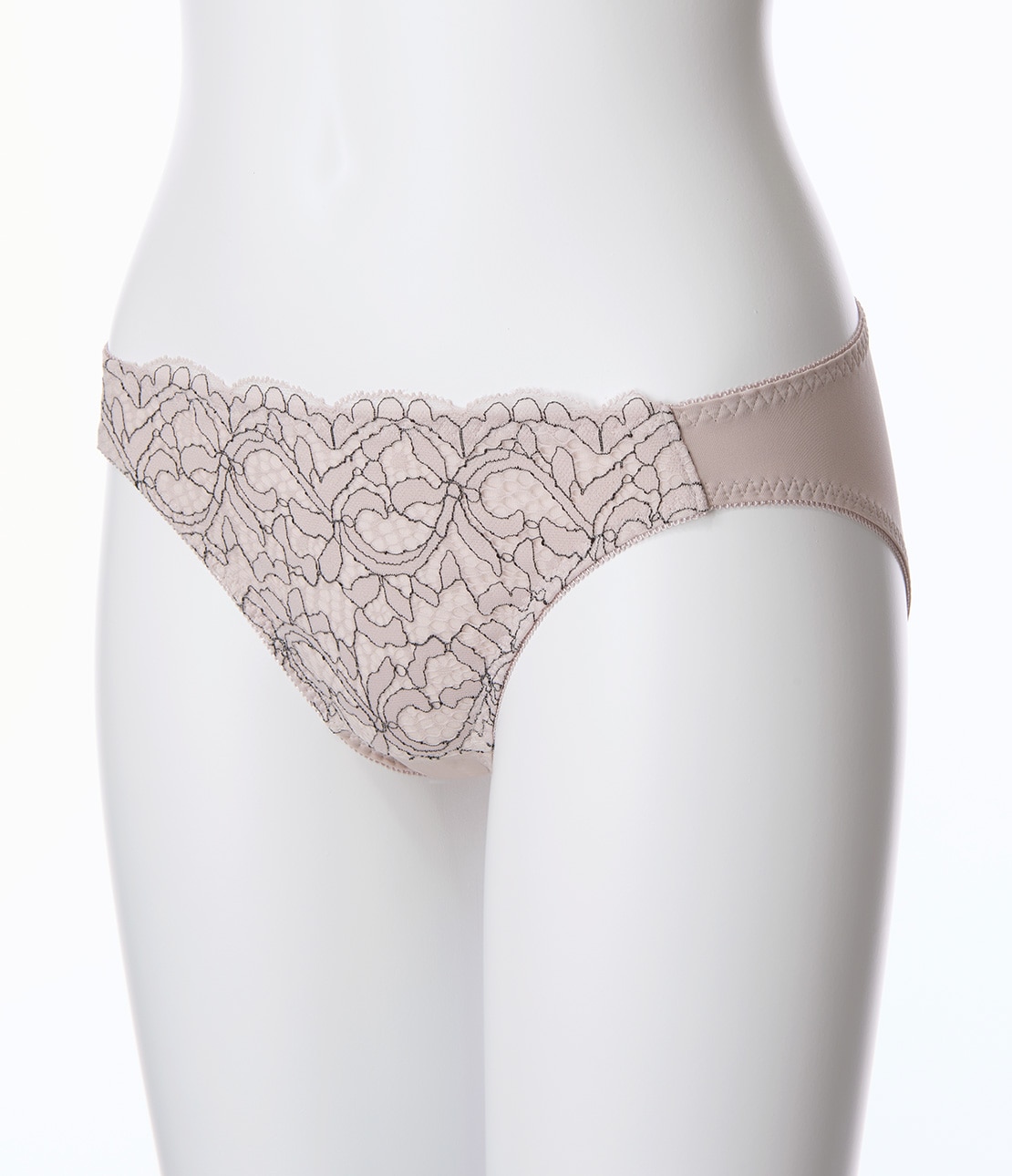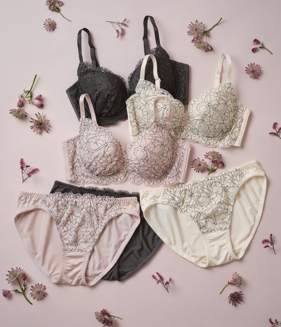 ・全色共通、ブラックの糸で柄のアウトラインを描いたツートーンレースを使用。メリハリある柄行きで、洗練された表情