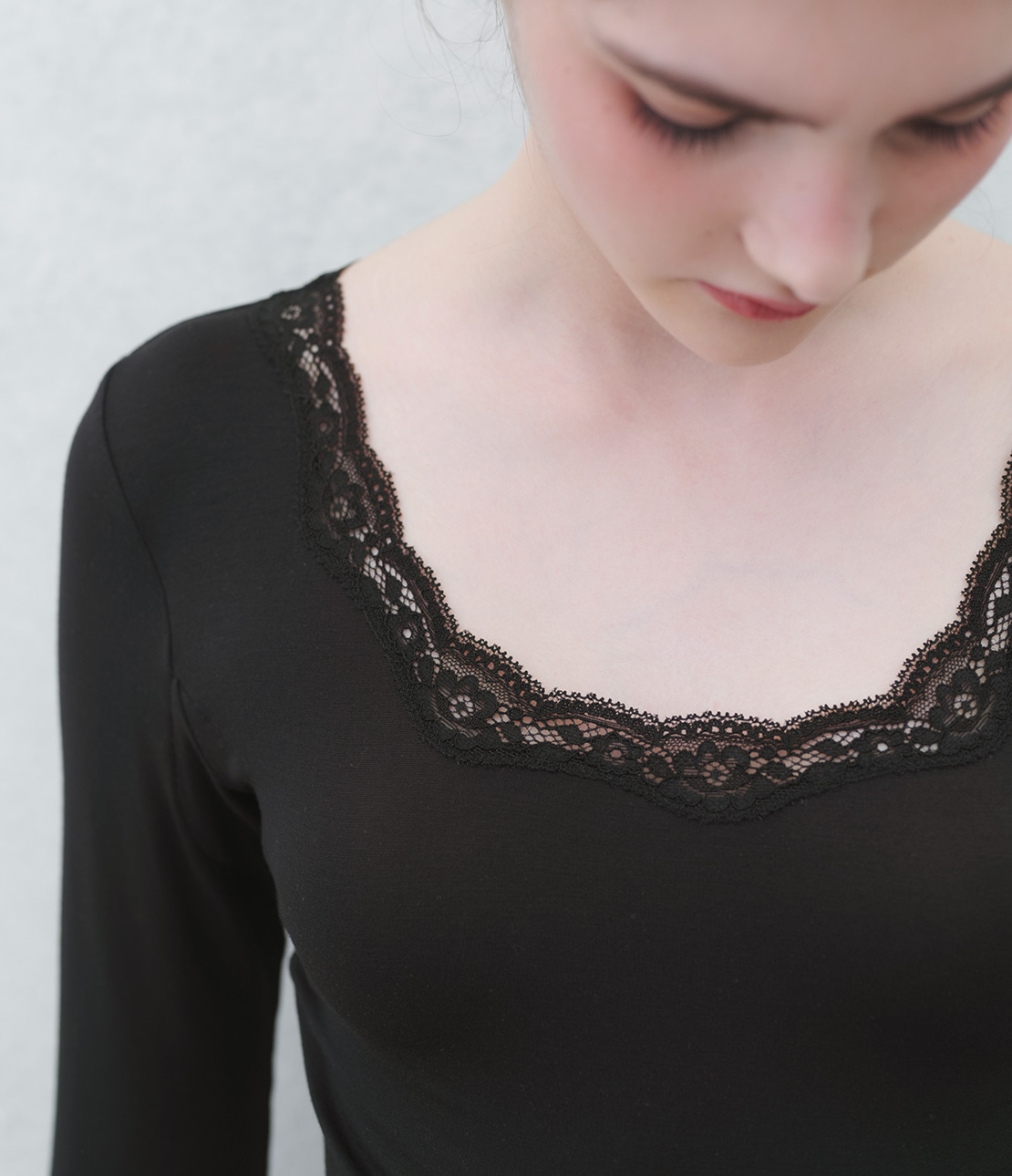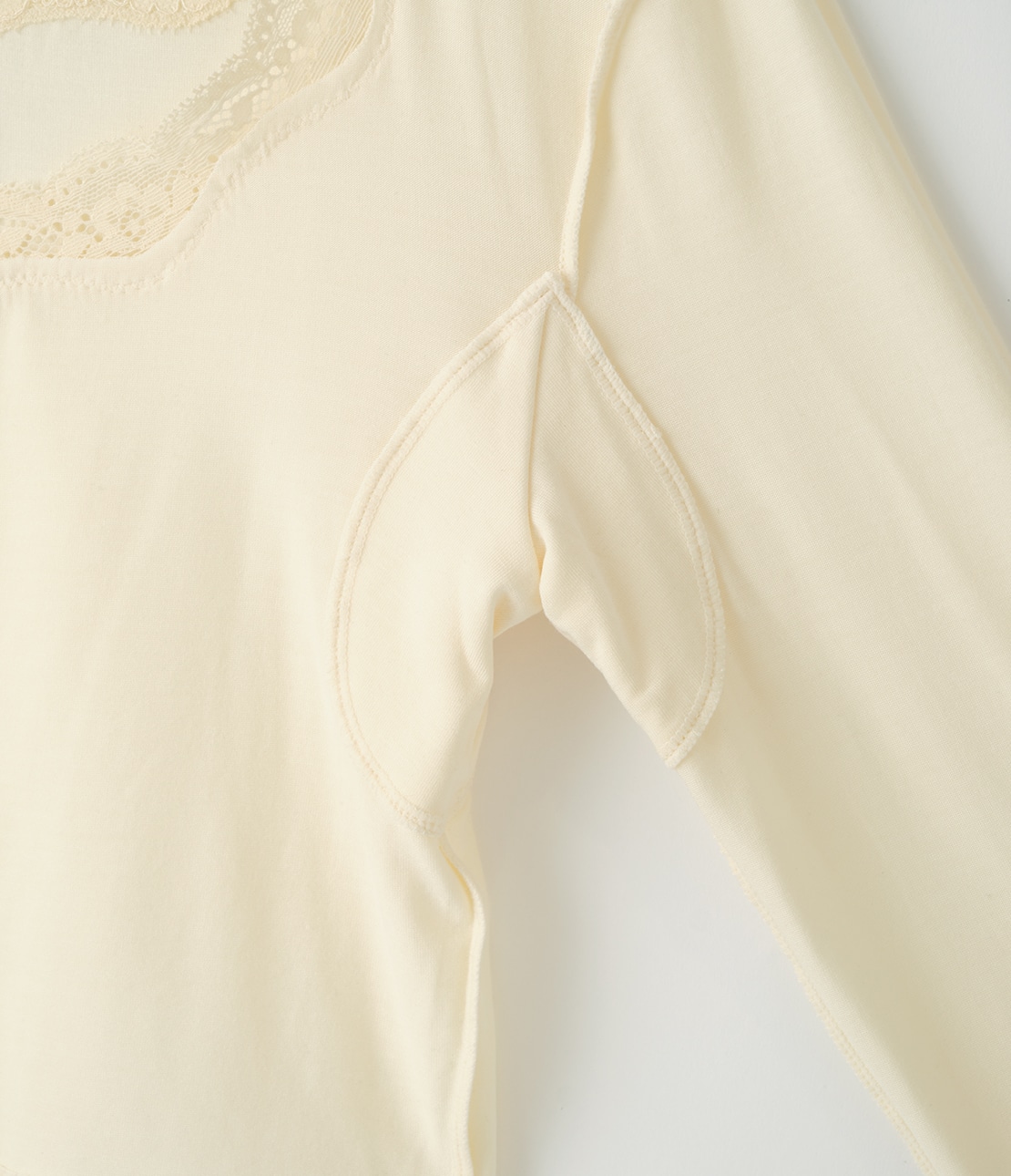 薄手のレーヨンベア天竺はとろみがあって伸びが良く、しっとり肌に吸い付くようにフィット。着ぶくれせず、肌と生地の間にすき間ができないからあたたかさを逃しにくい。さらに乾燥が気になる季節に嬉しい保湿加工付き。