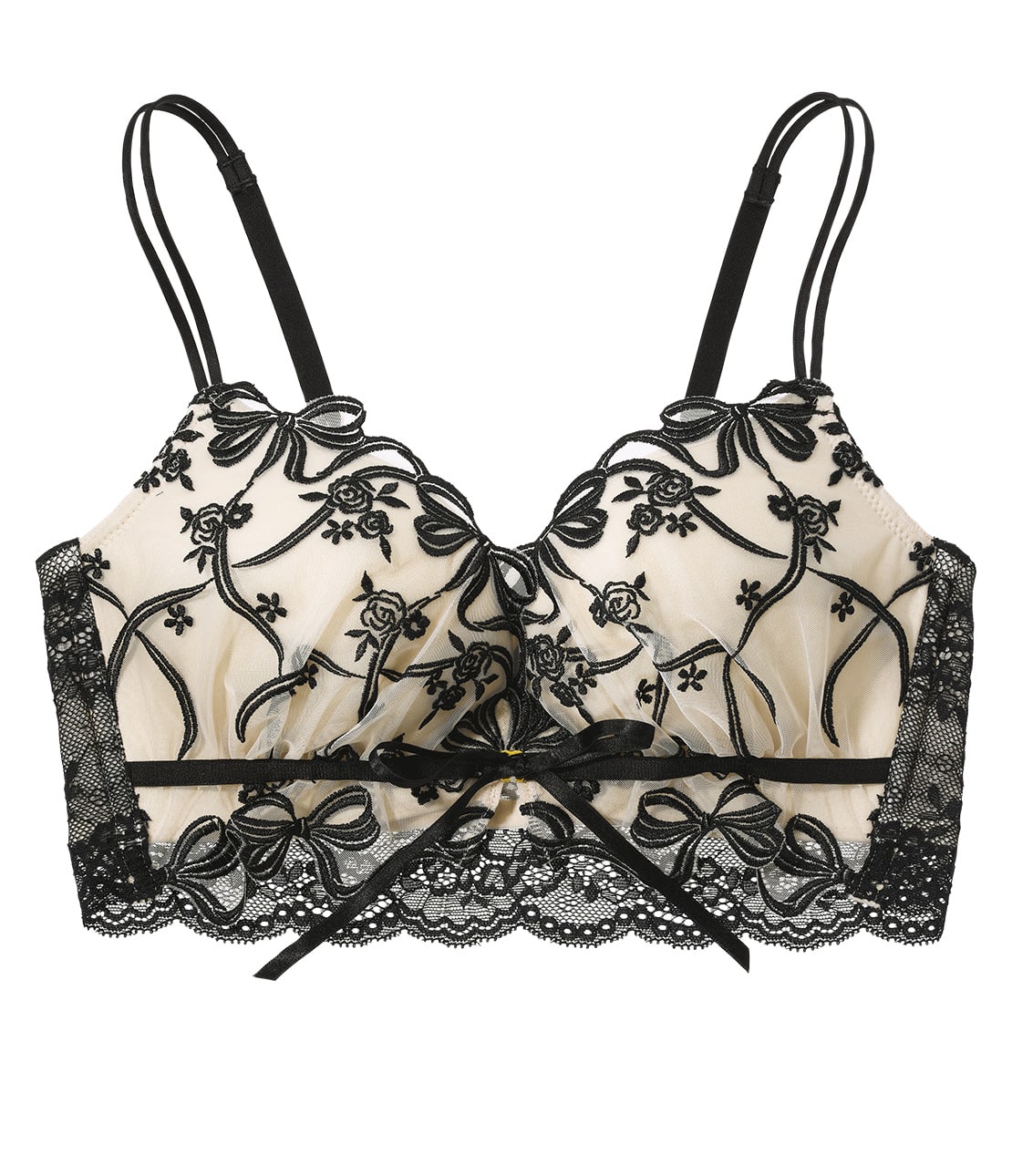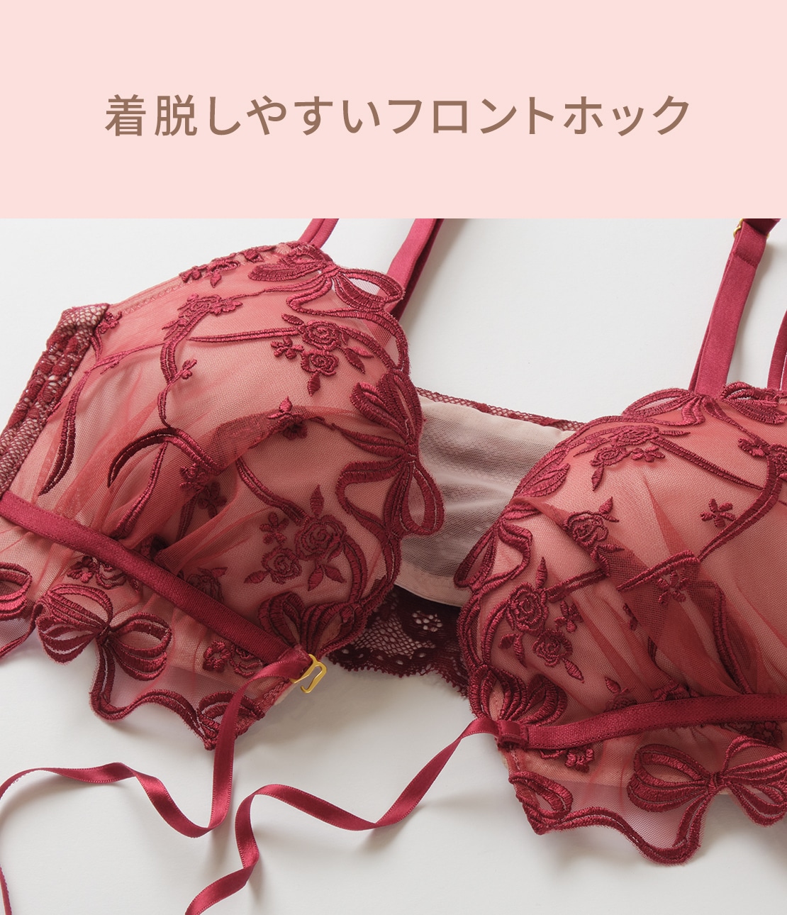 ・大ぶりのリボン&ローズモチーフの刺しゅうレースでフロント全体を包んだ、豪華で可愛らしいルックス