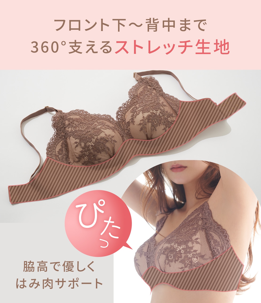 ・表側のストレッチレースは、カップのサイド部にパネル切り替えを配し、バストの横流れを抑えてサポート。