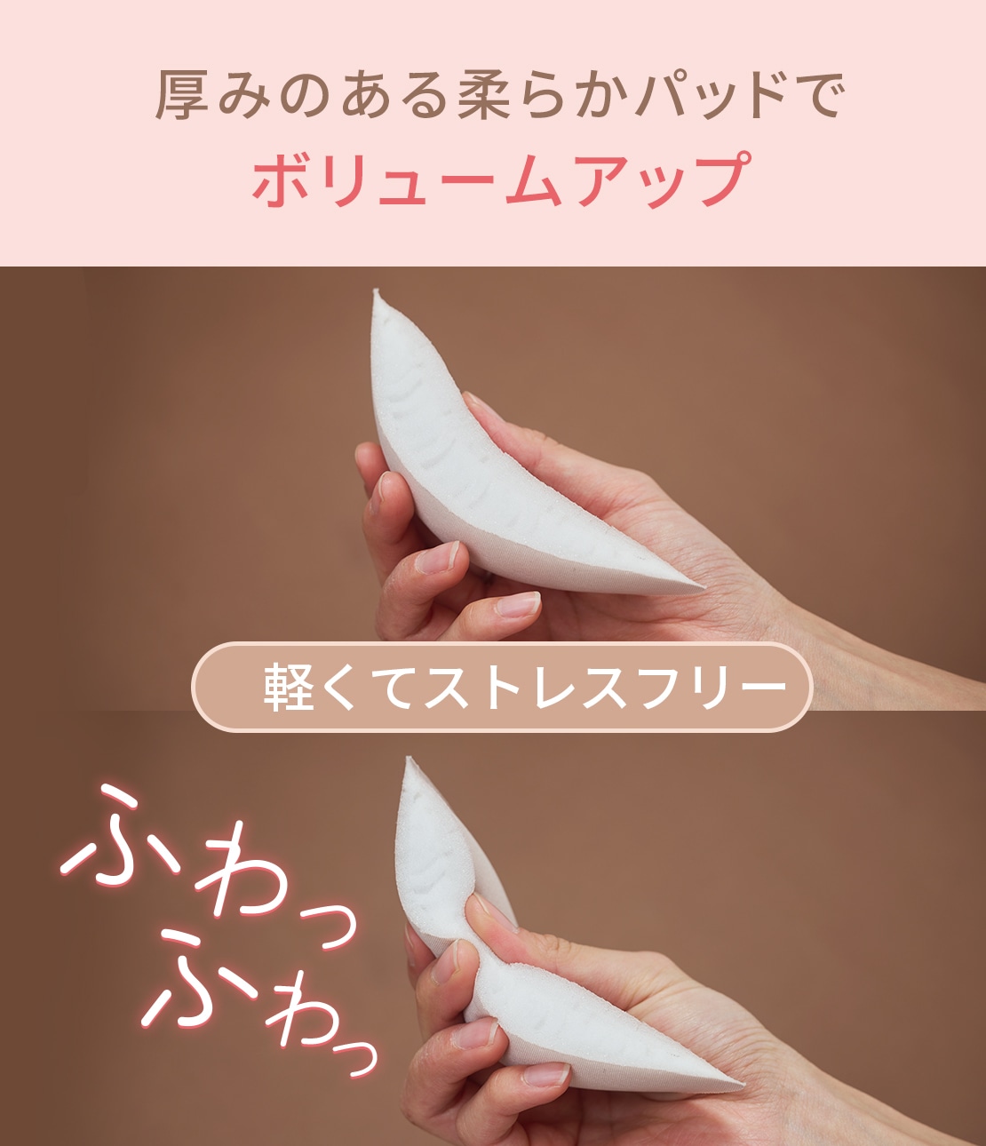 ・カップに厚みのあるふわふわ柔らかいパッド内蔵で、肌なじみが良くすき間ができにくい。