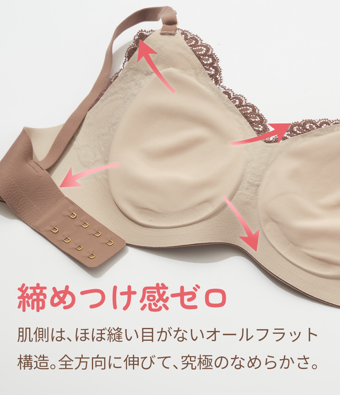 ・肌側は、縫い目がほとんどないオールフラット構造。究極になめらかな肌あたりで、着けたまま寝られる快適さ。