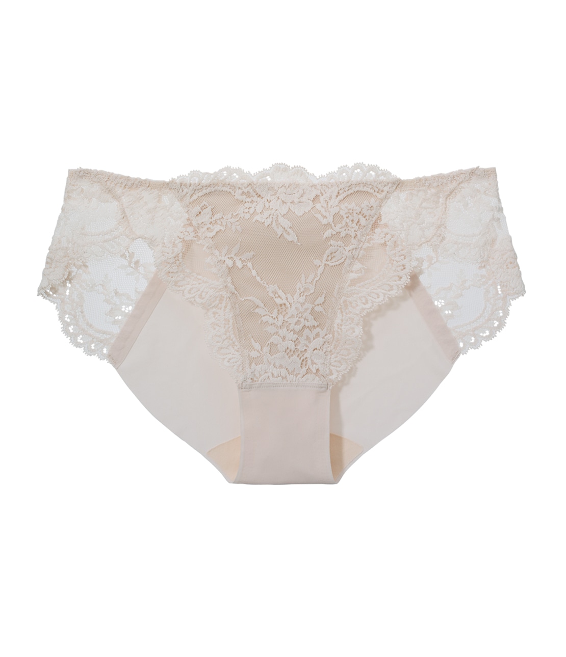 ・サイドはストレッチ生地とストレッチレースの切り替え部を生地テープでカバーし、肌あたりに配慮。