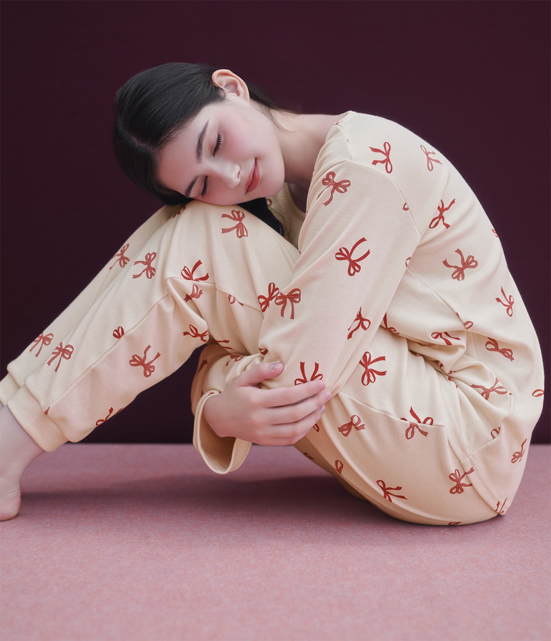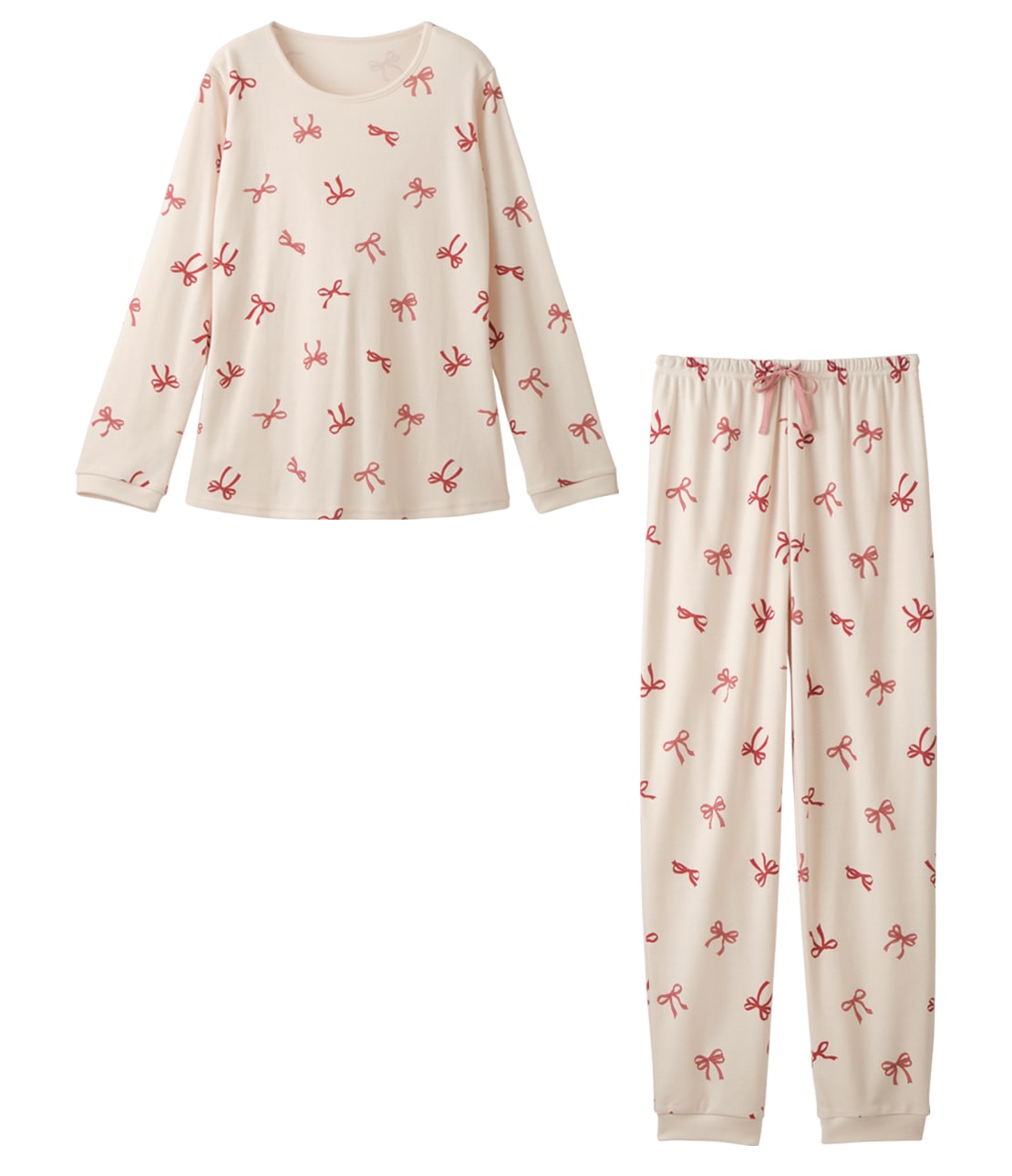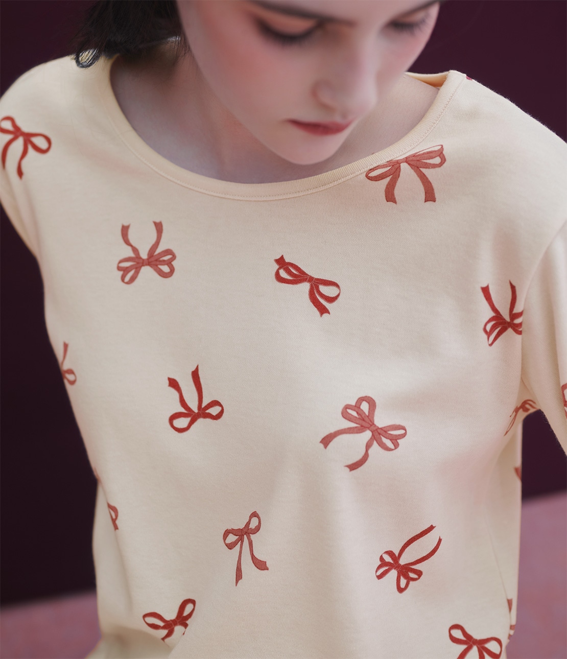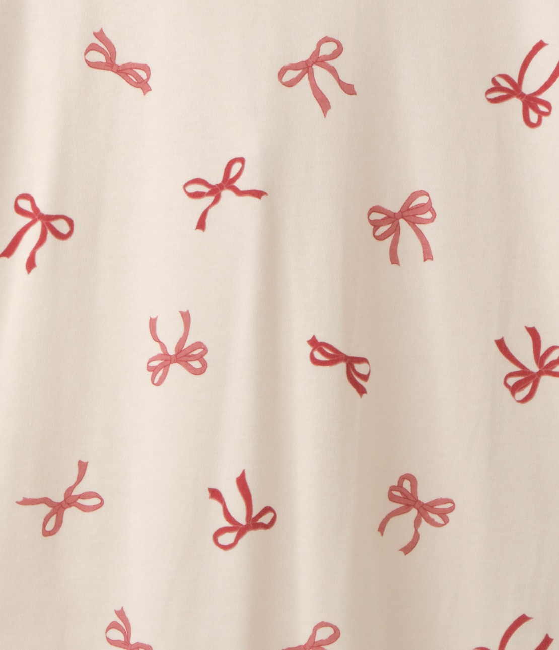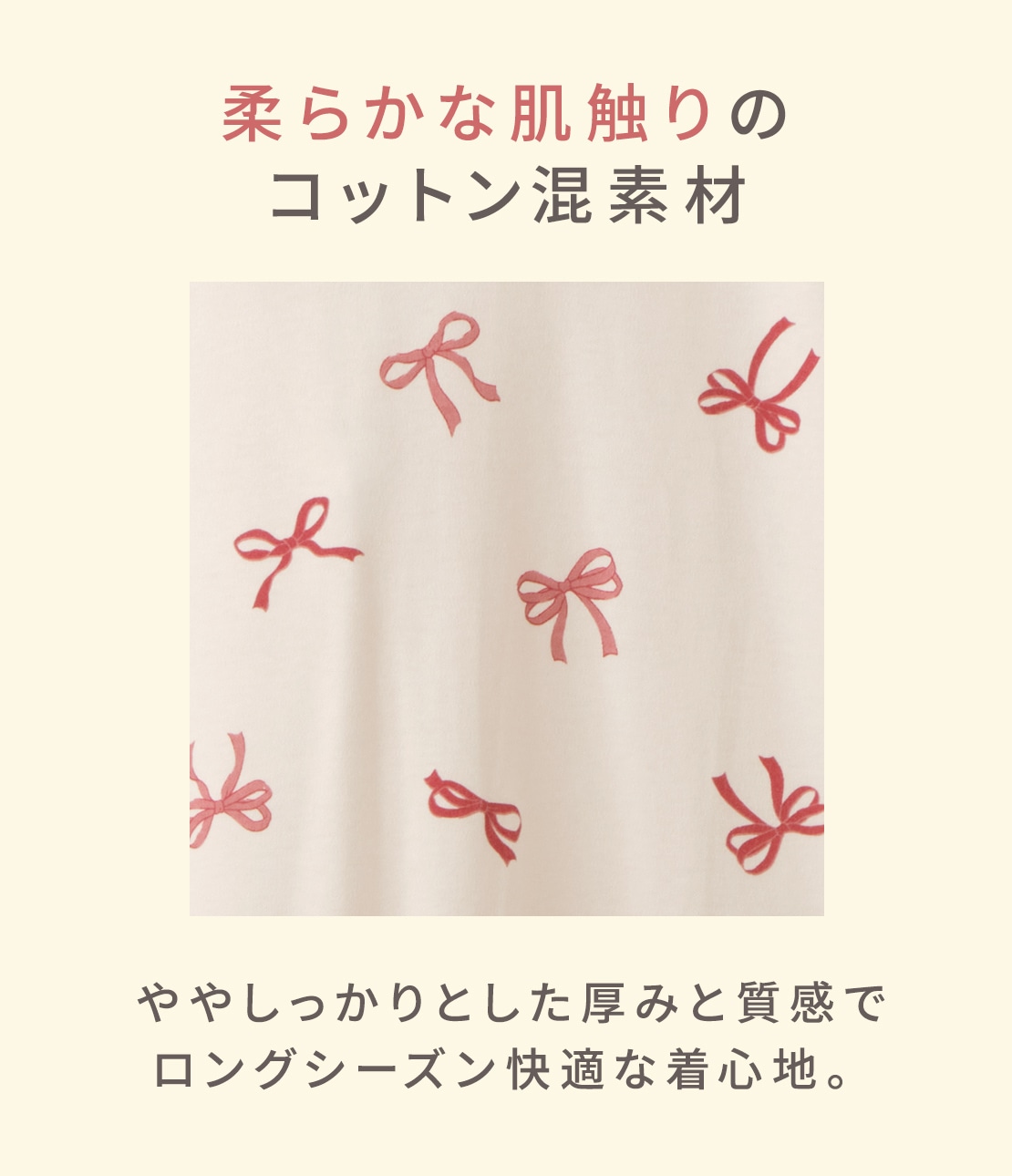 ・シンプルな形にリボン柄プリントをのせて、キュートに仕上げたカットソーパジャマ。