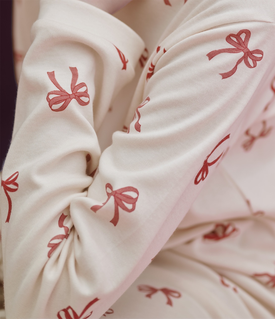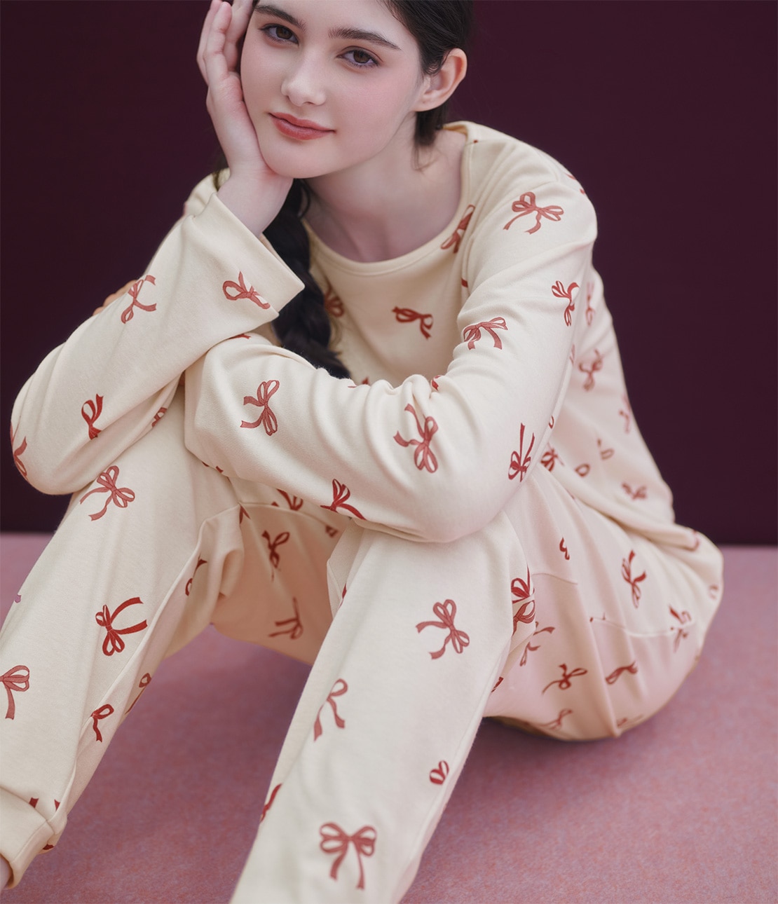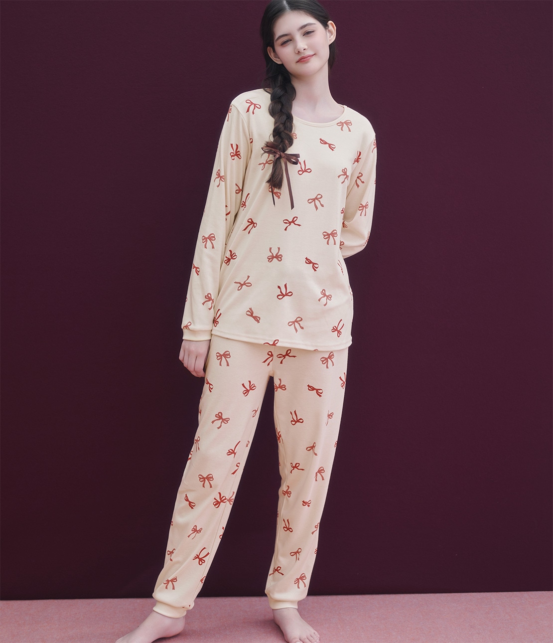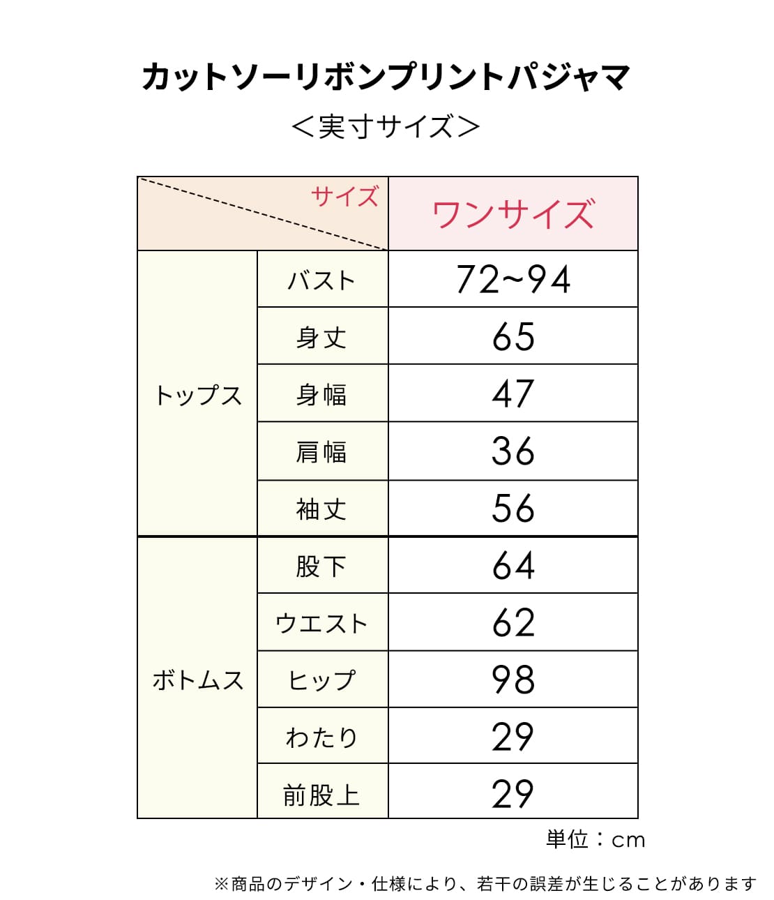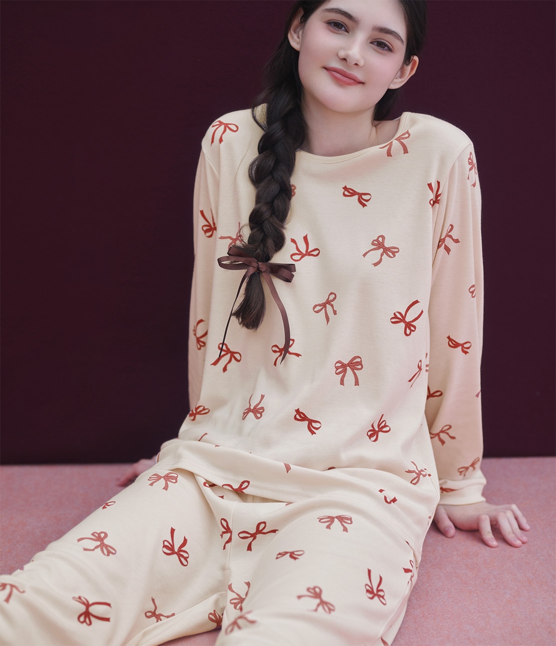 ・シンプルな形にリボン柄プリントをのせて、キュートに仕上げたカットソーパジャマ。