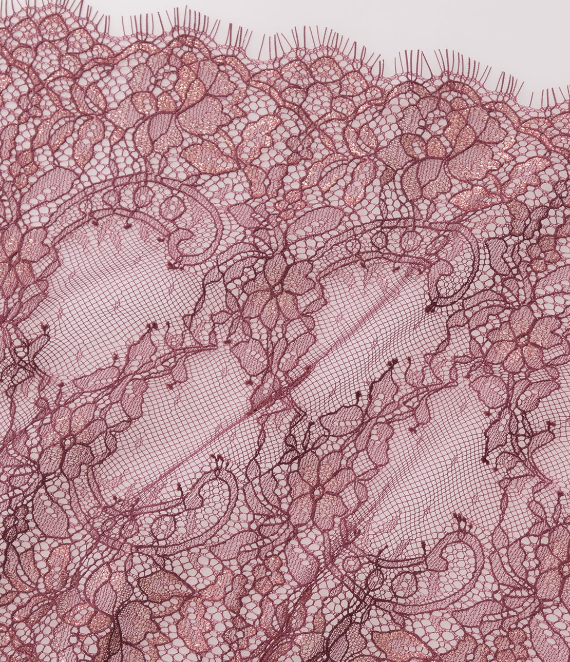 ・ラメ糸入りアイラッシュレースに飾りストリングをあしらった、ラグジュアリーかつセンシュアルなデザイン。