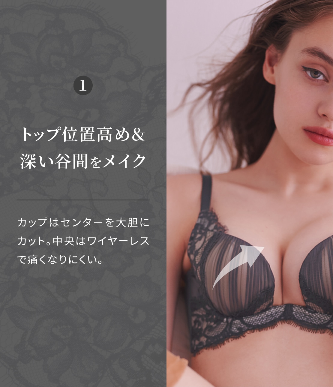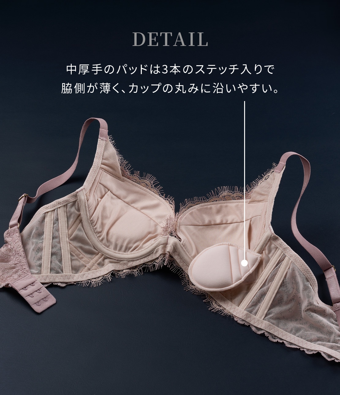 ・均一な厚みのカップに、中厚手の取り外しできるパッド入り。ボリュームのあるくっきり谷間を寄せる。