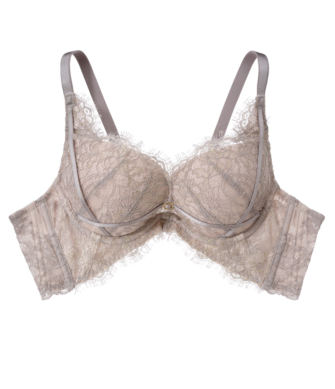 ・ゴールドのラメ糸入りリジッドアイラッシュレースを、カップとカップ周りのパネルに使用。繊細なスカラップが、ネックラインとアンダーバストを華やかに飾る
