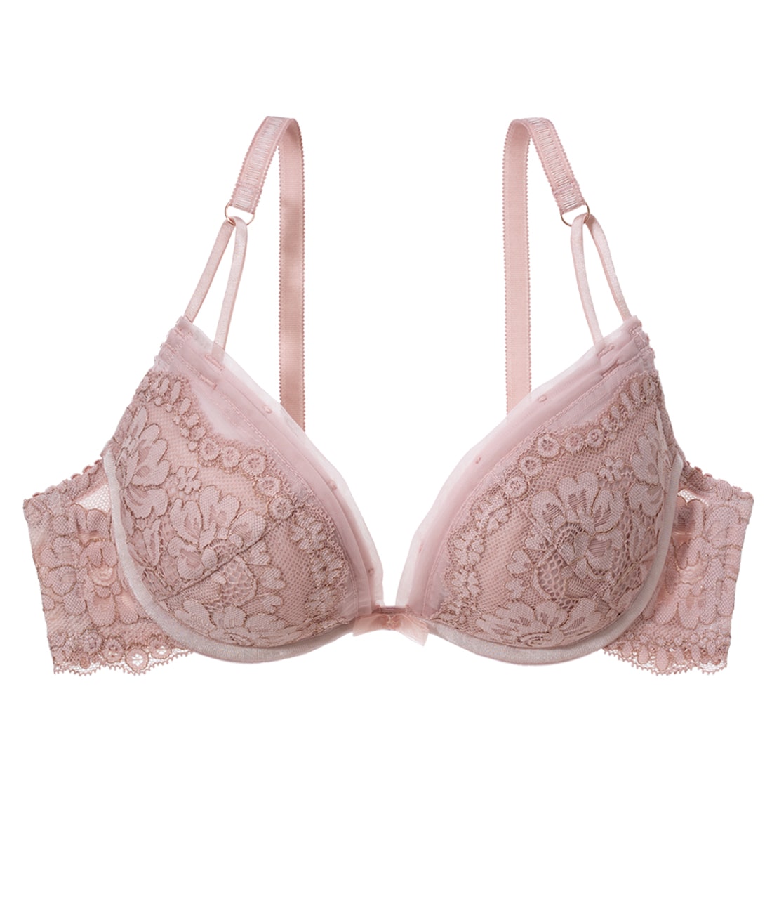 ・カップとサイドベルトに、ピンクゴールドラメ糸入りのレースを使用。ほのかに輝き上品な華やかさ
