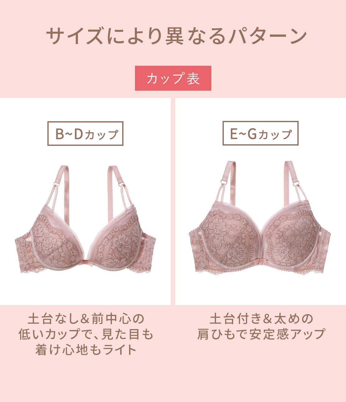 ・E~Gカップはカップ下にパネル付きの設計&幅太めの肩ひもで、グラマーバストをサポート。カップは脇側を補強して、横広がりを抑える。