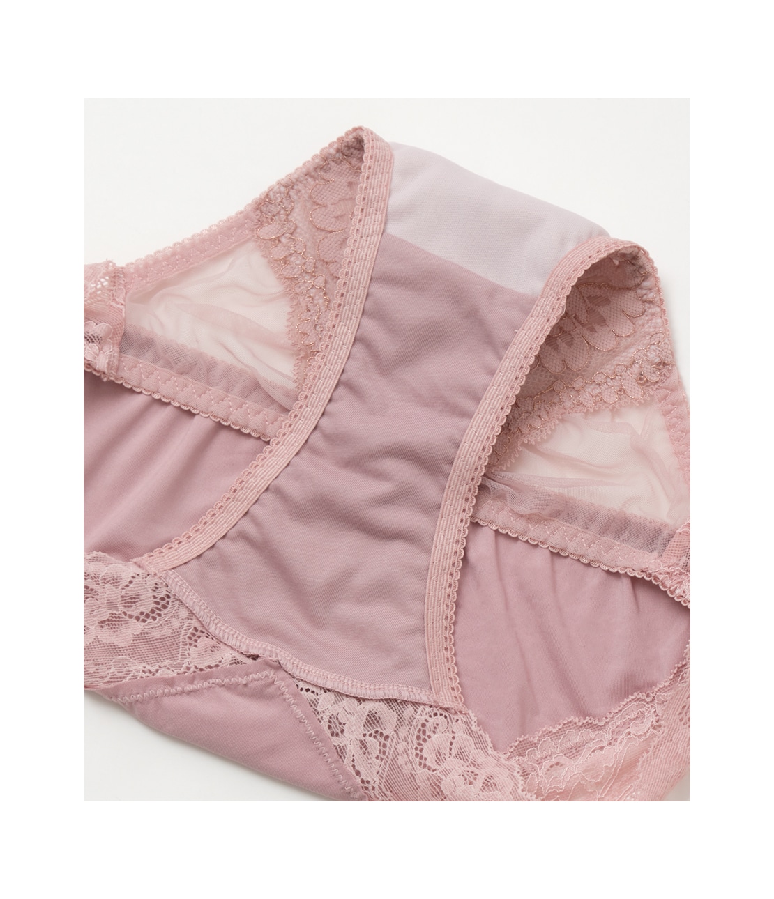 ・脚ぐりをラメのない細幅ストレッチレースに切り替え。ゴムを使わないので肌あたりがやさしく、洋服にラインがひびきにくい。