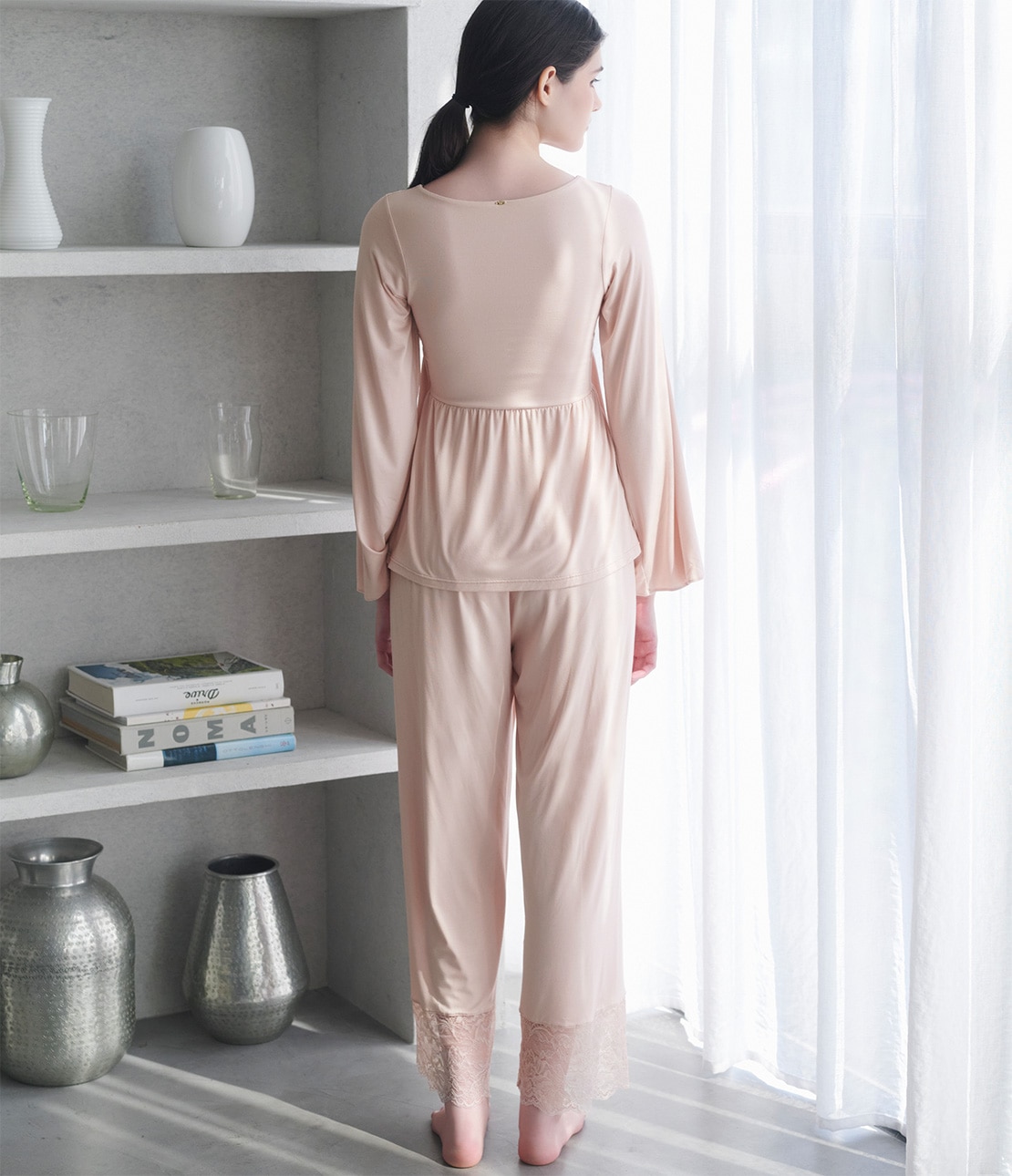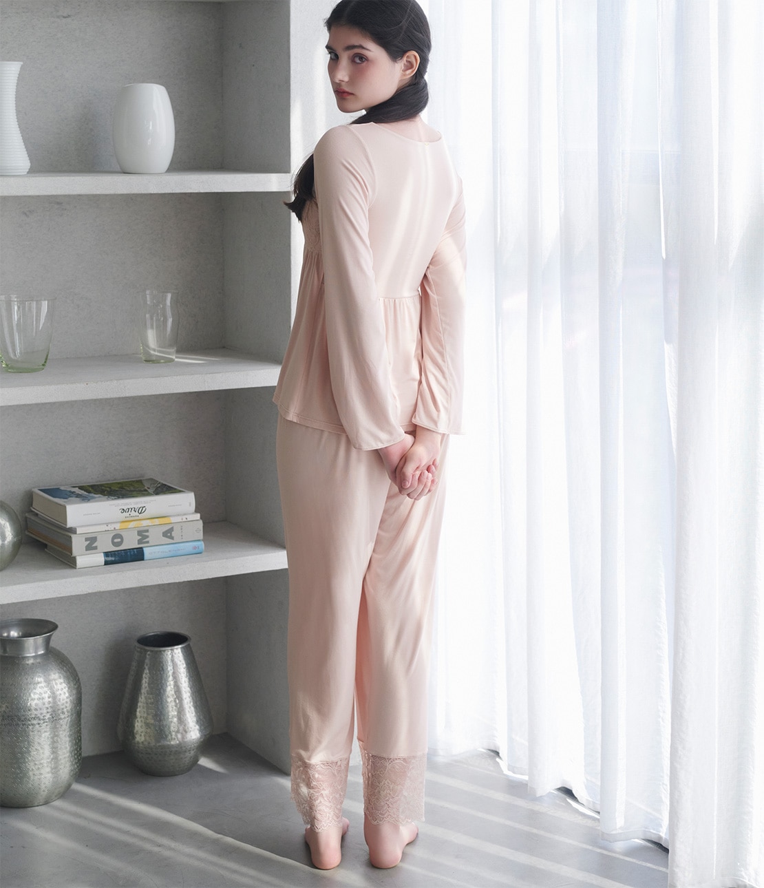 ・トップスの胸元とボトムスの裾は、華やかなストレッチレース