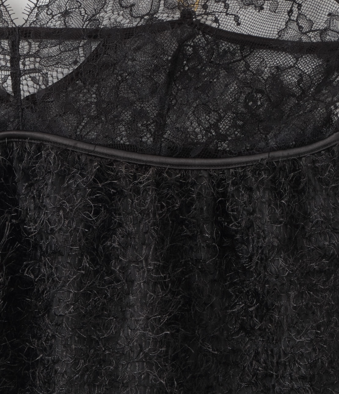 ・アンダーバストから下は、柔らかく長い毛足のシャギージャカード生地。遊び心を感じさせる、可愛らしく華やかな素材