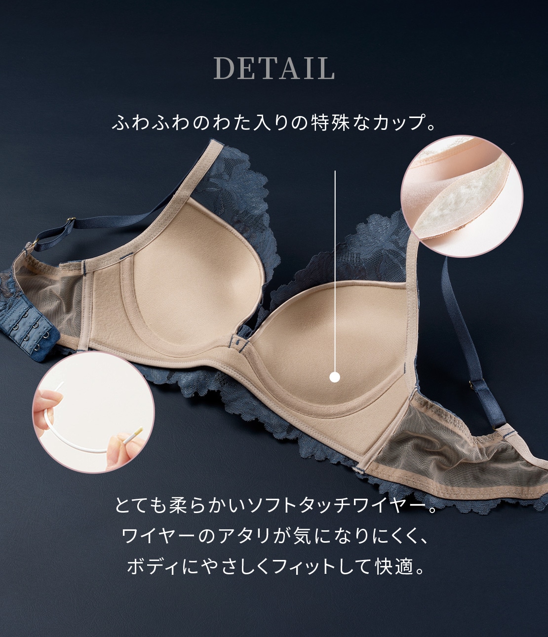 C、D65・70、E65:ふわふわのわたを内蔵した下厚カップ。トップ位置を高くキープし、ボリュームUP。