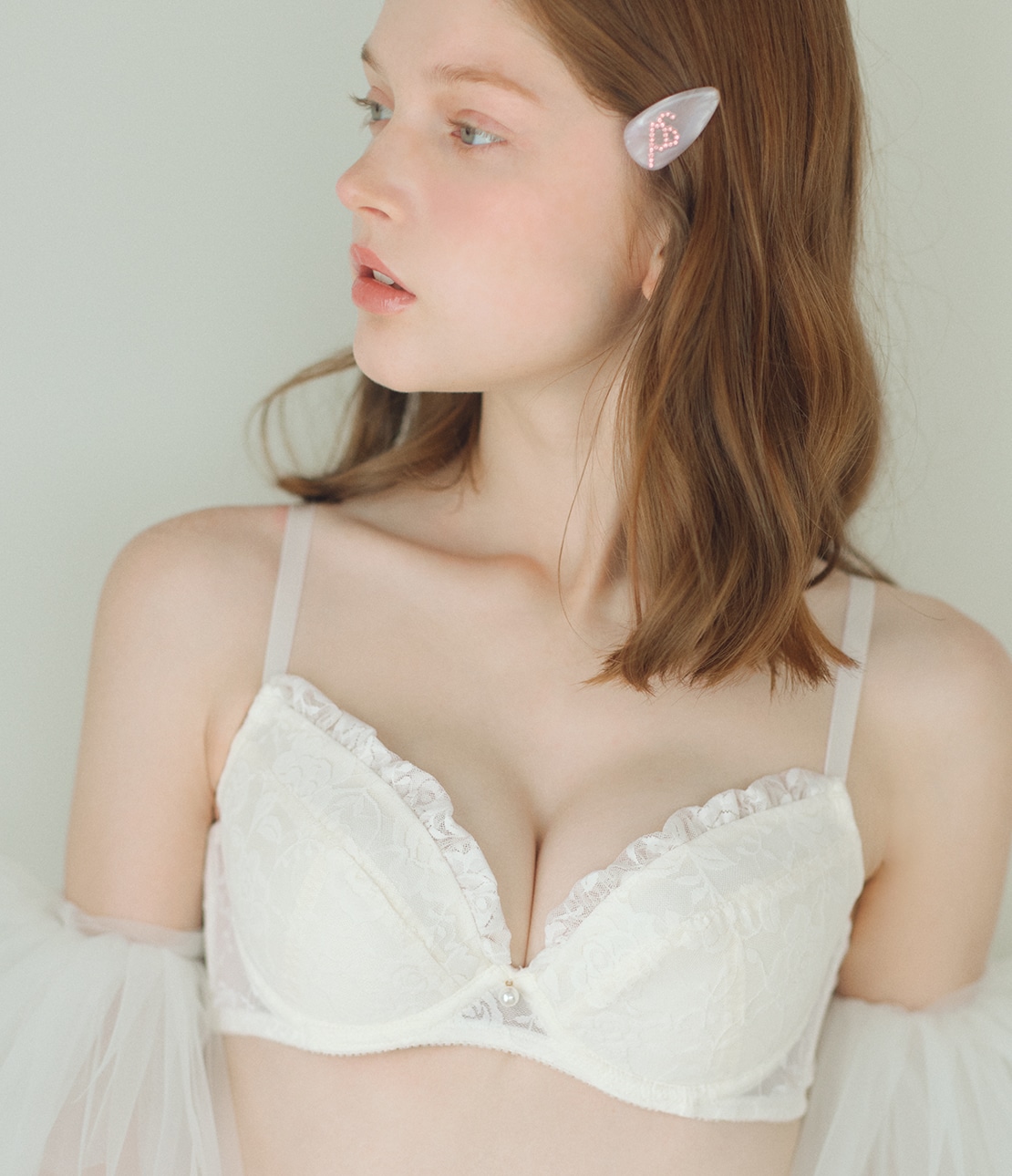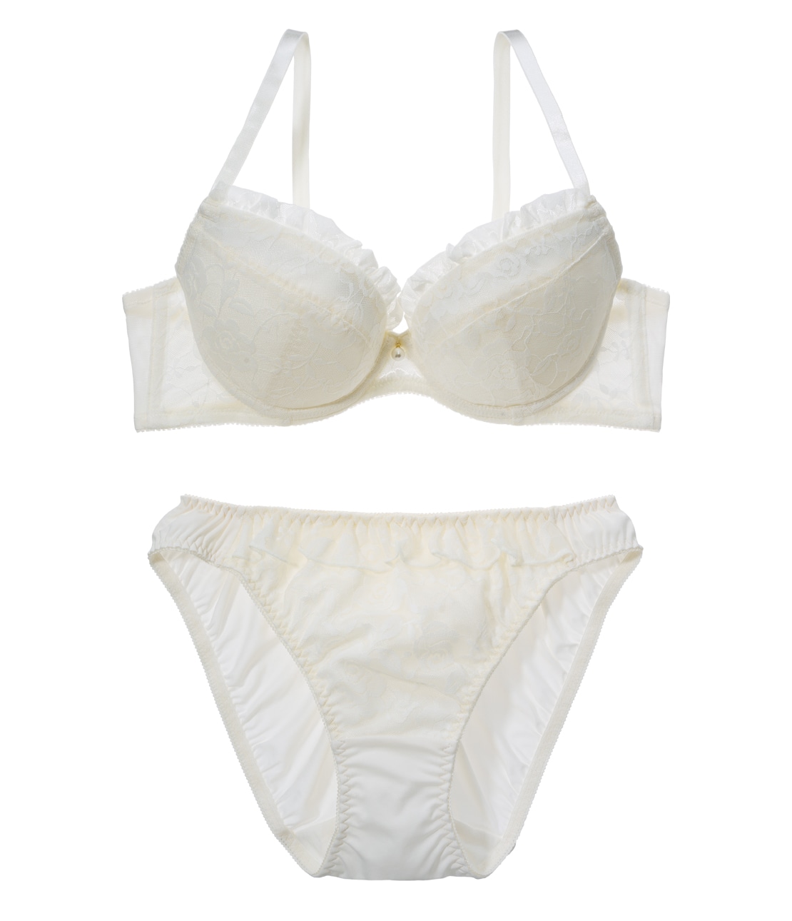 ちょうどいい寄せ感で自然な丸みに。フリル&パールが上品なブラ&ショーツセット。