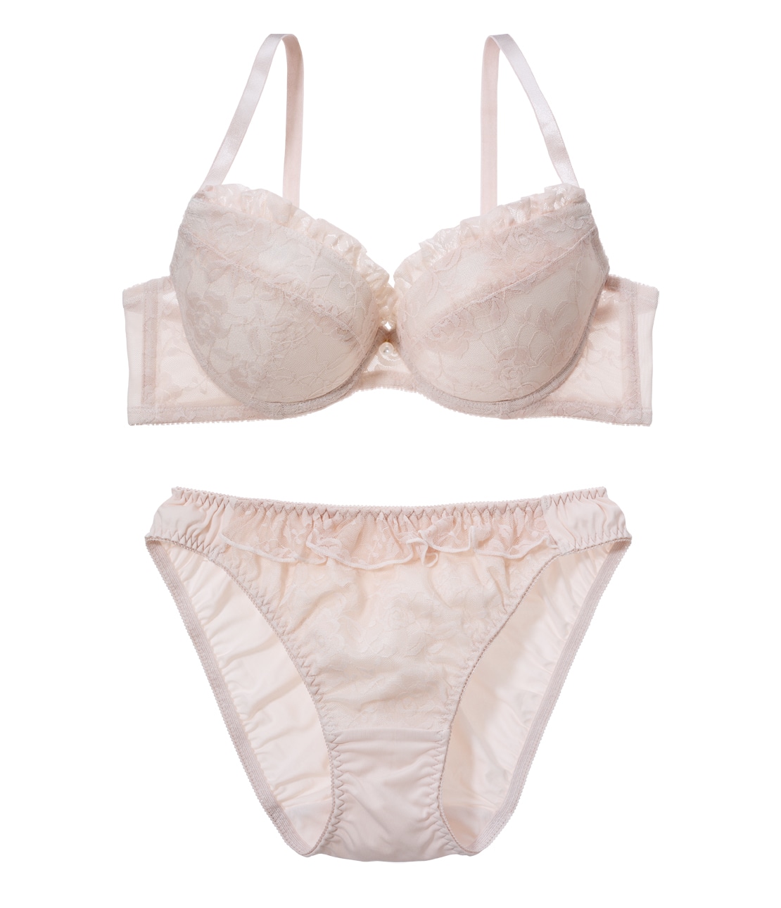 ちょうどいい寄せ感で自然な丸みに。フリル&パールが上品なブラ&ショーツセット。