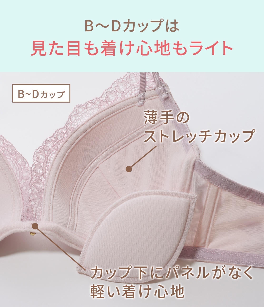 ・B~Dカップはカップ下にパネルのないアンダーフリー設計で、見た目も着け心地もライト。