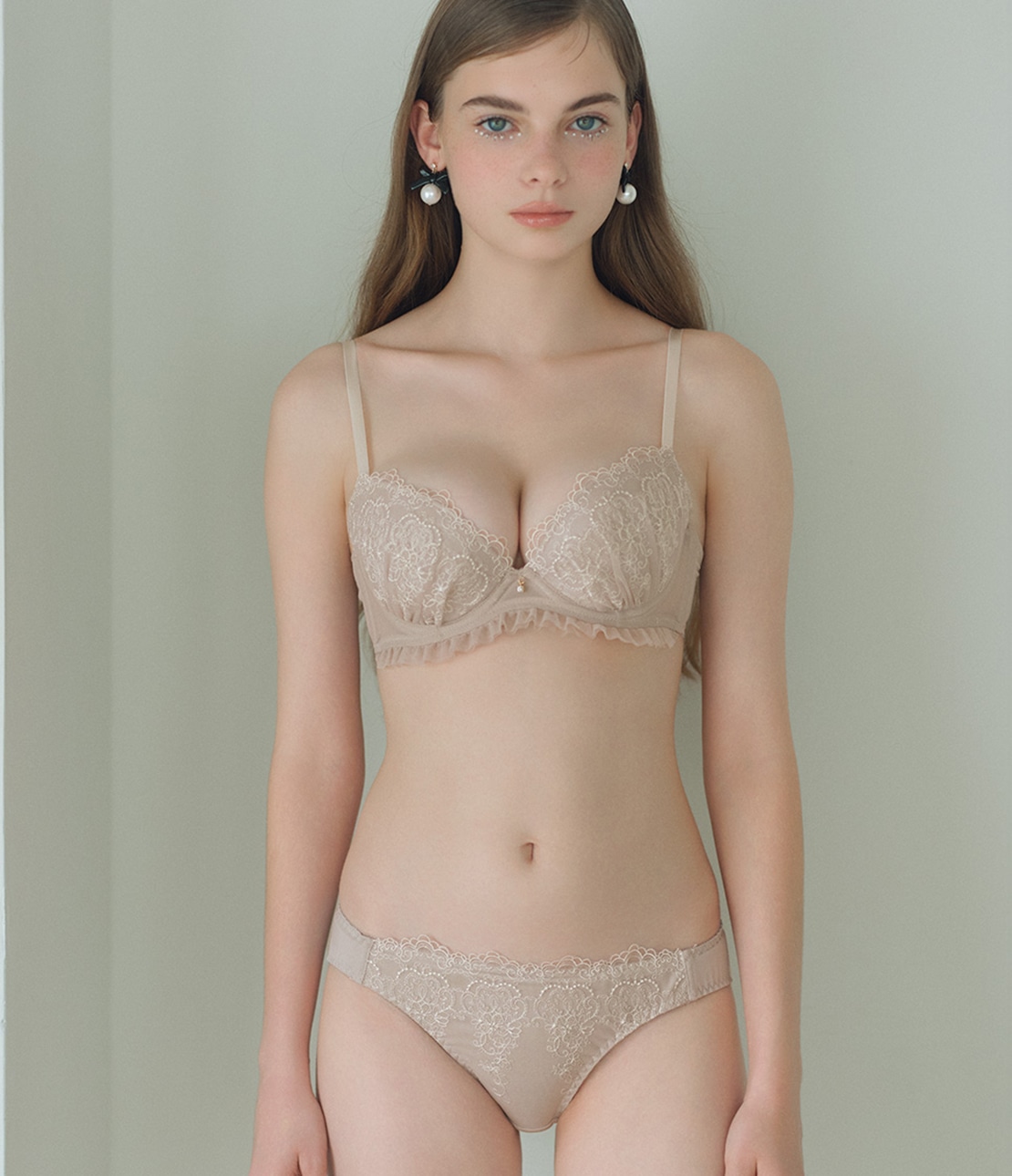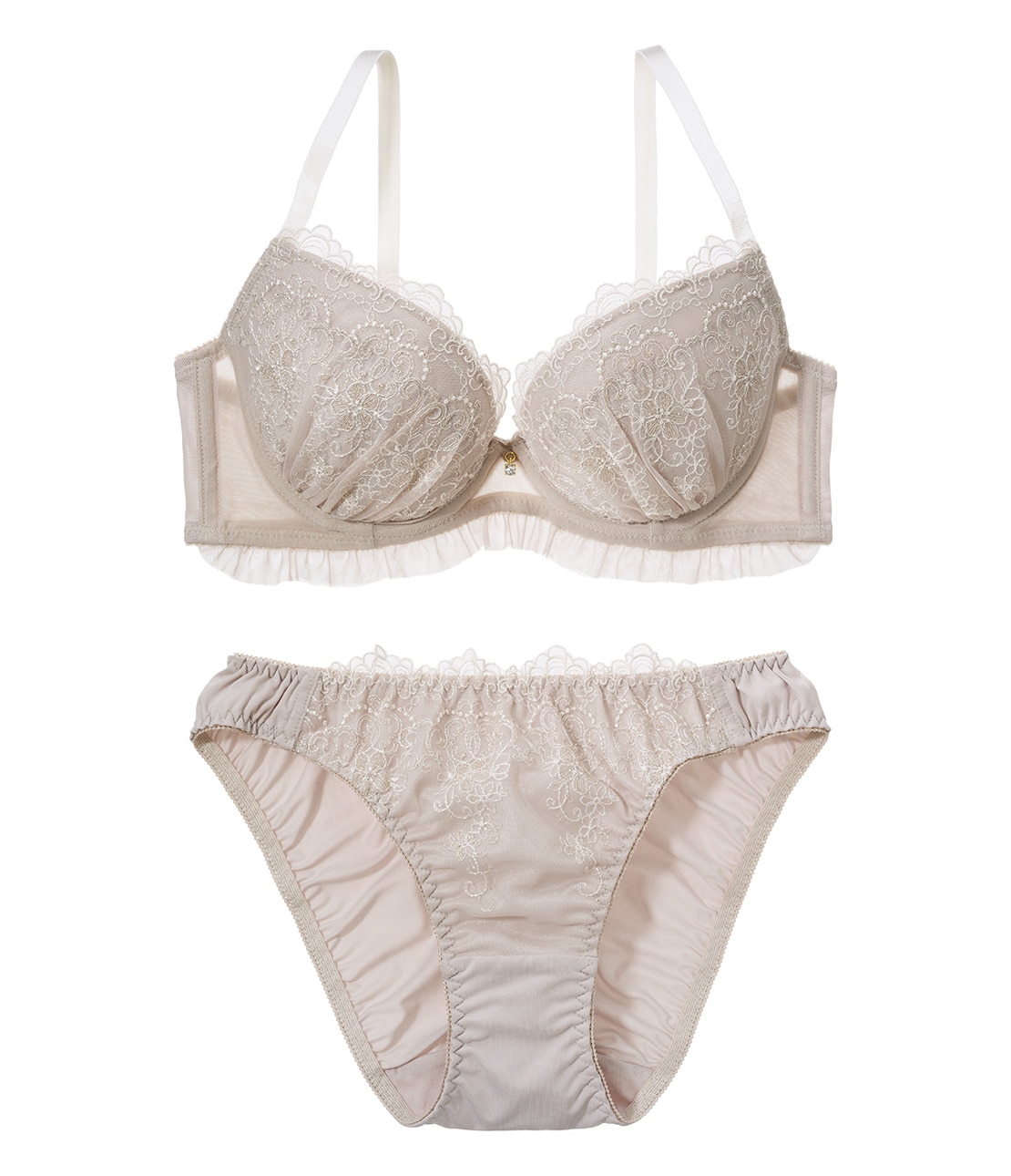 ・ラメ糸入りの刺しゅうレースにギャザーを寄せて、ふんわりとカップをカバー。ラメは他の刺しゅう糸に近い色味で、さりげなく輝き上品な印象