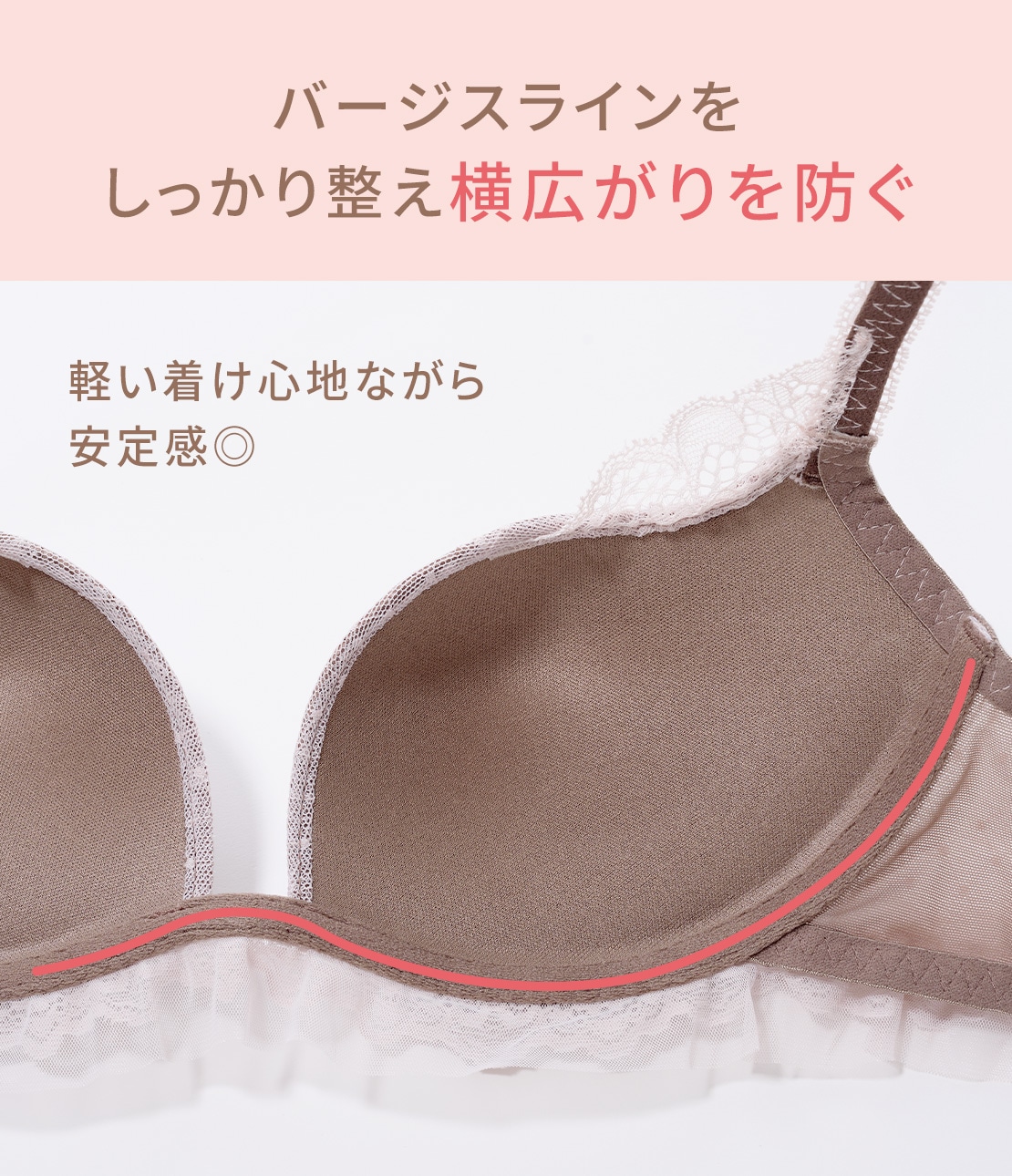 ・ワイヤーブラ並みにバージスライン(バストの輪郭)をしっかりマークし、バストラインを美しくキープ。