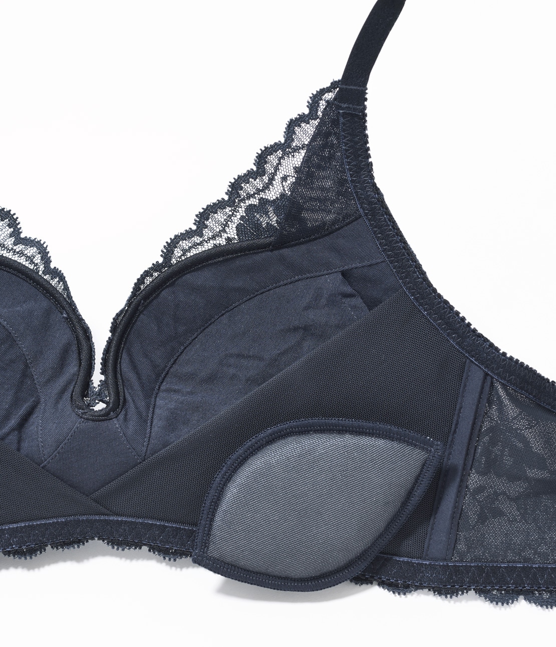 ・フロント全体が一体型の下厚モールドカップで、安定感のある着け心地。