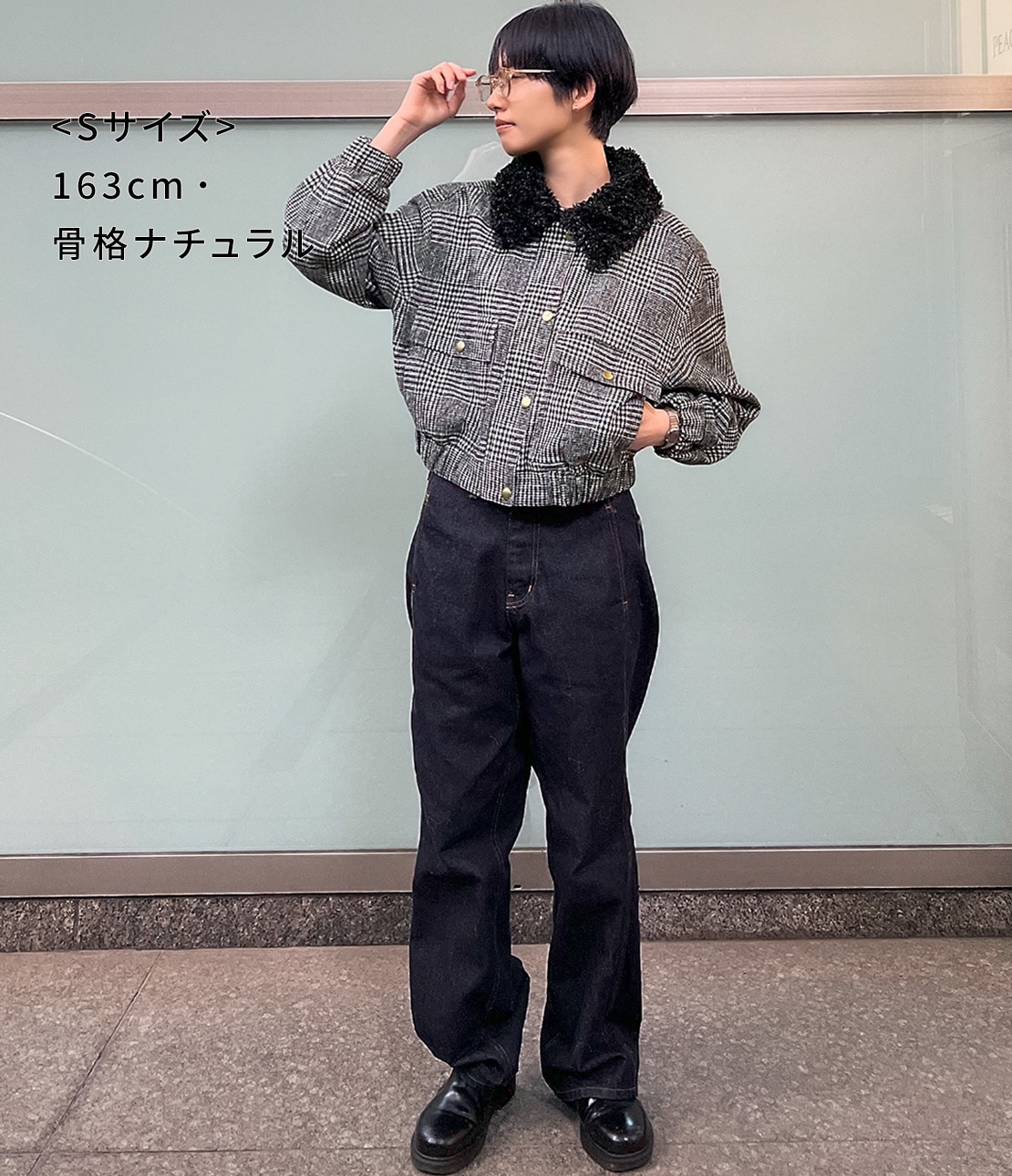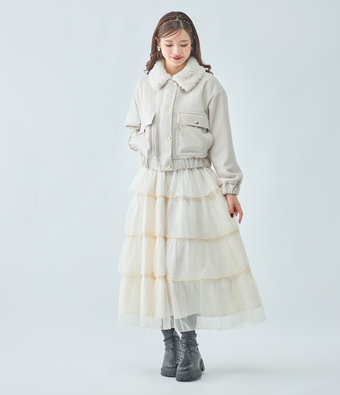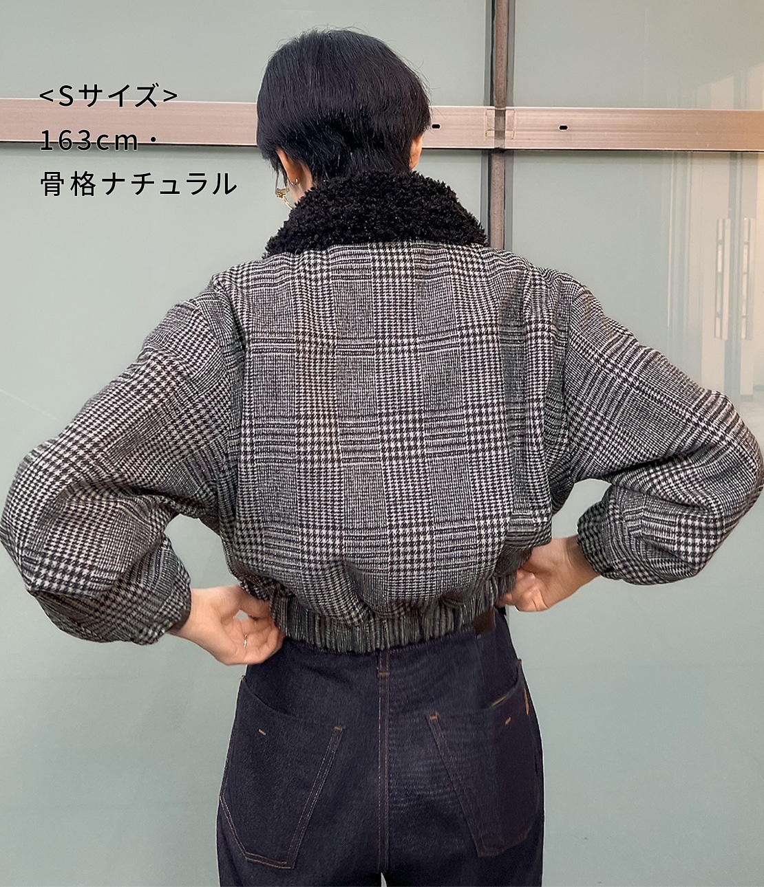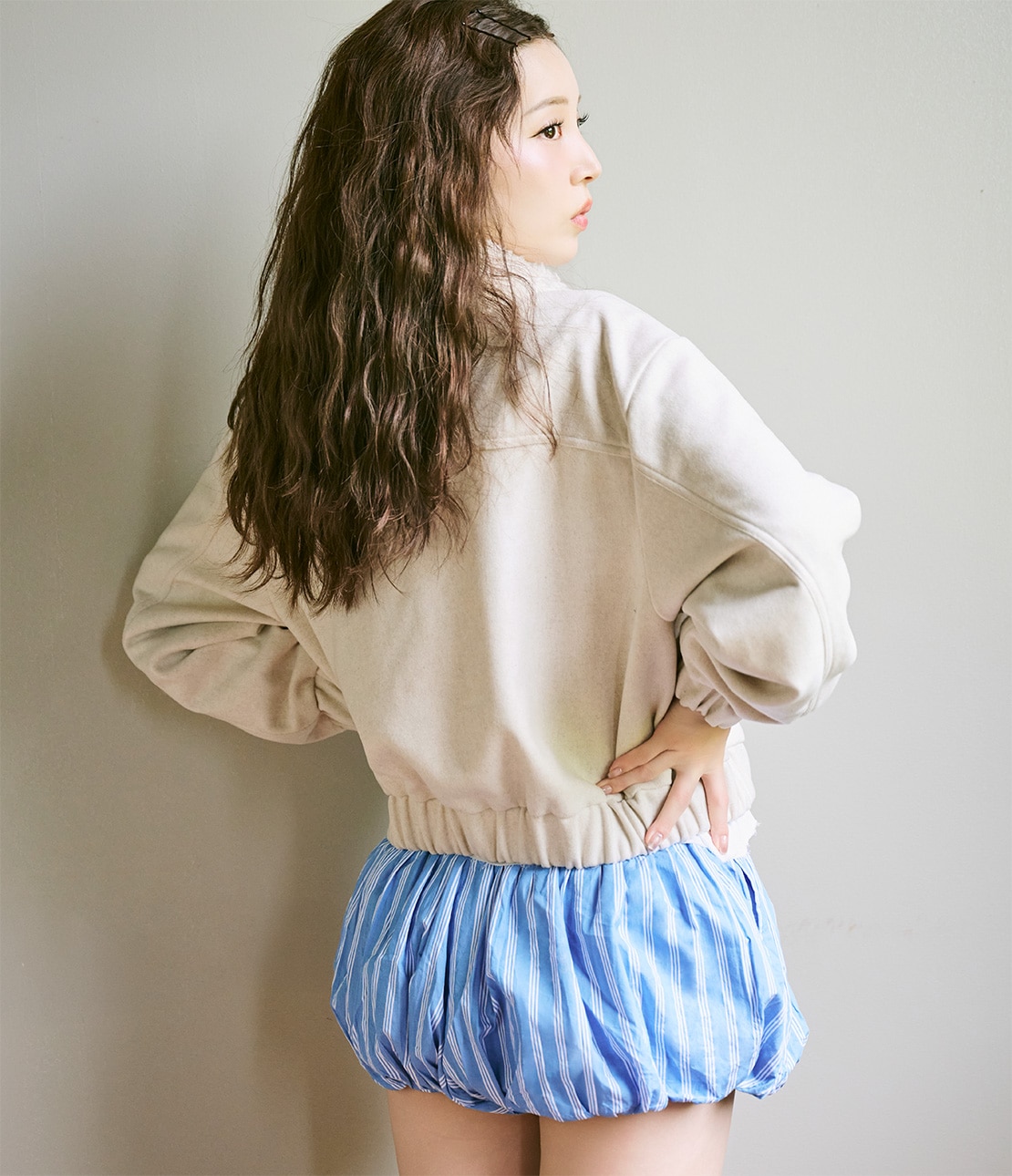 ・ショート丈なので重くならず、重心を引き上げて脚長バランスに見せる。