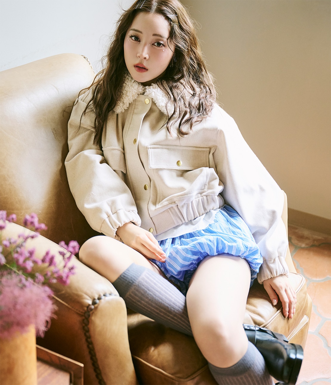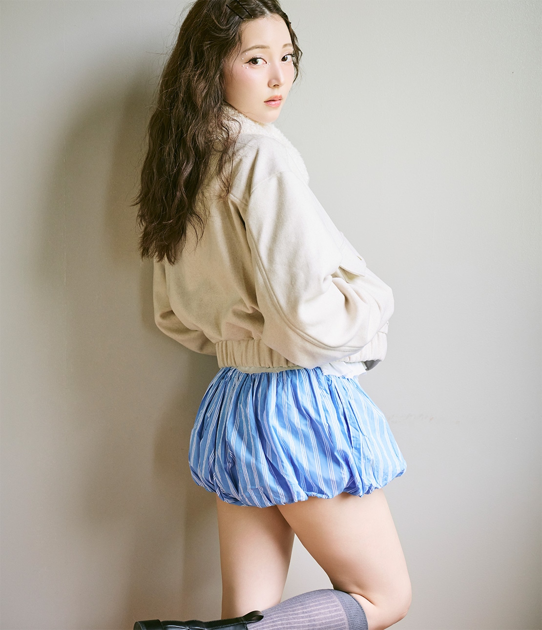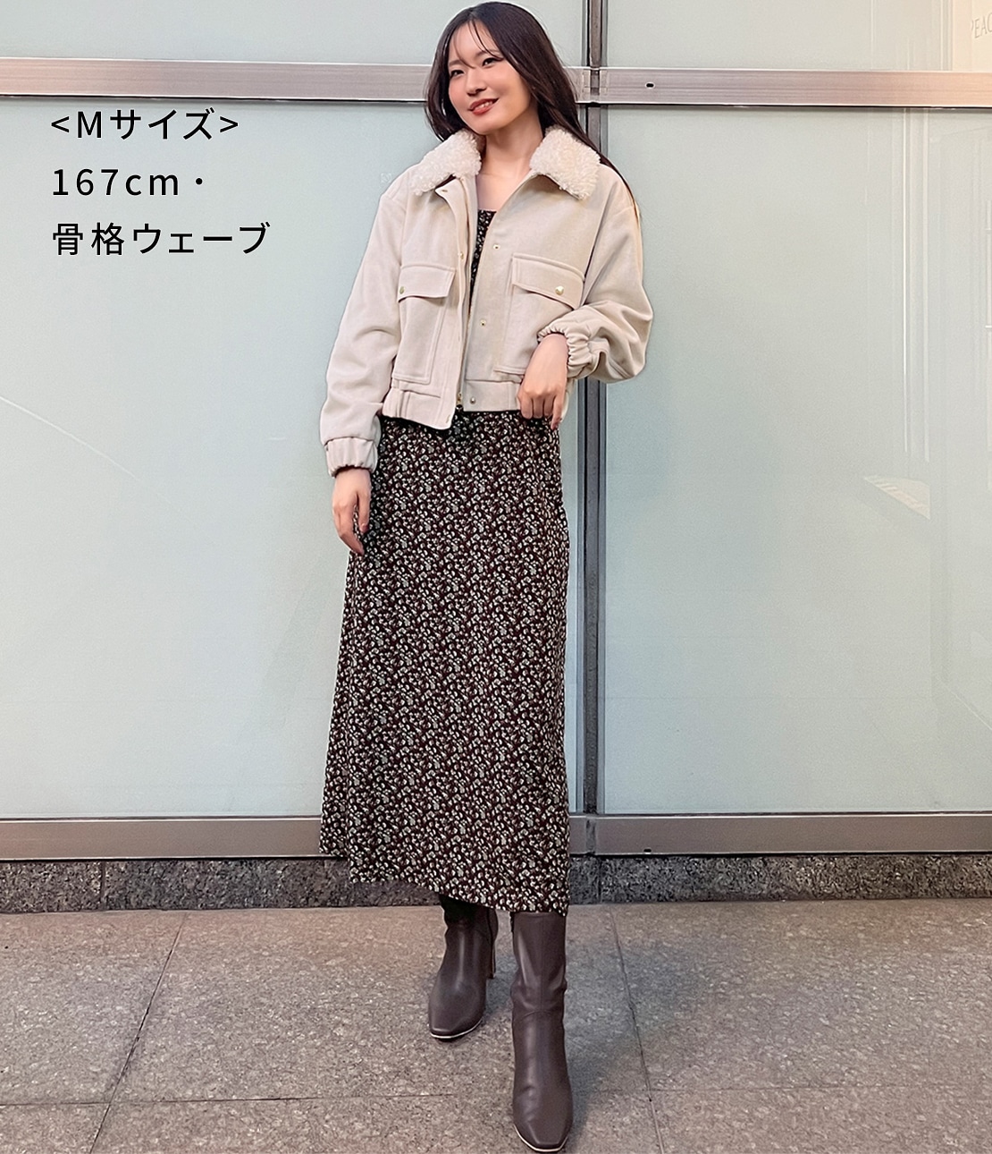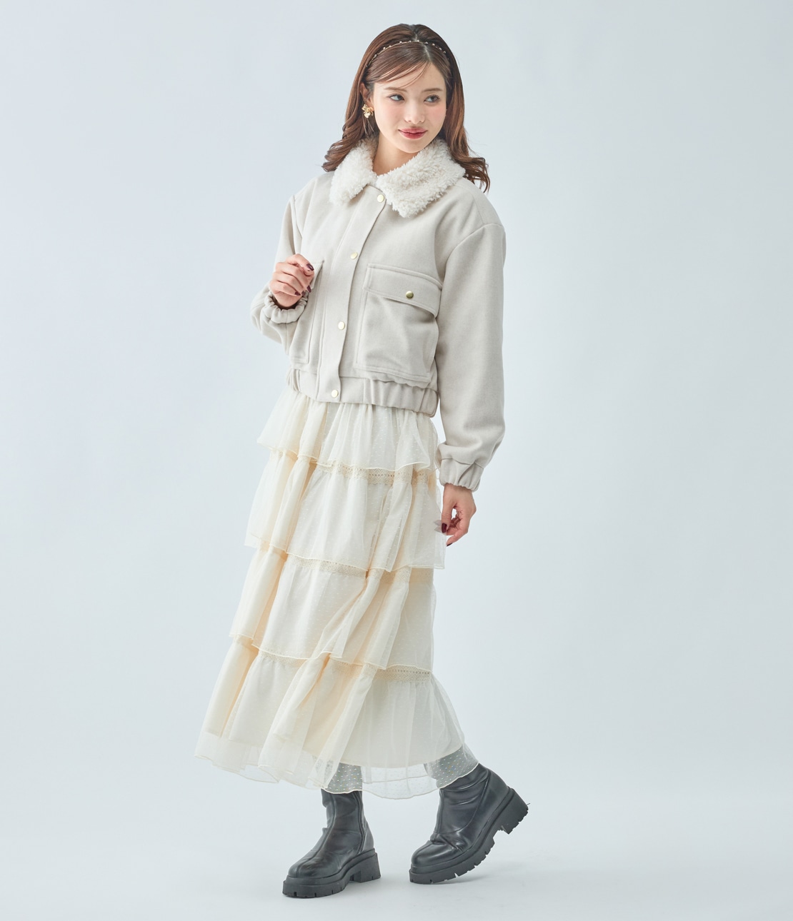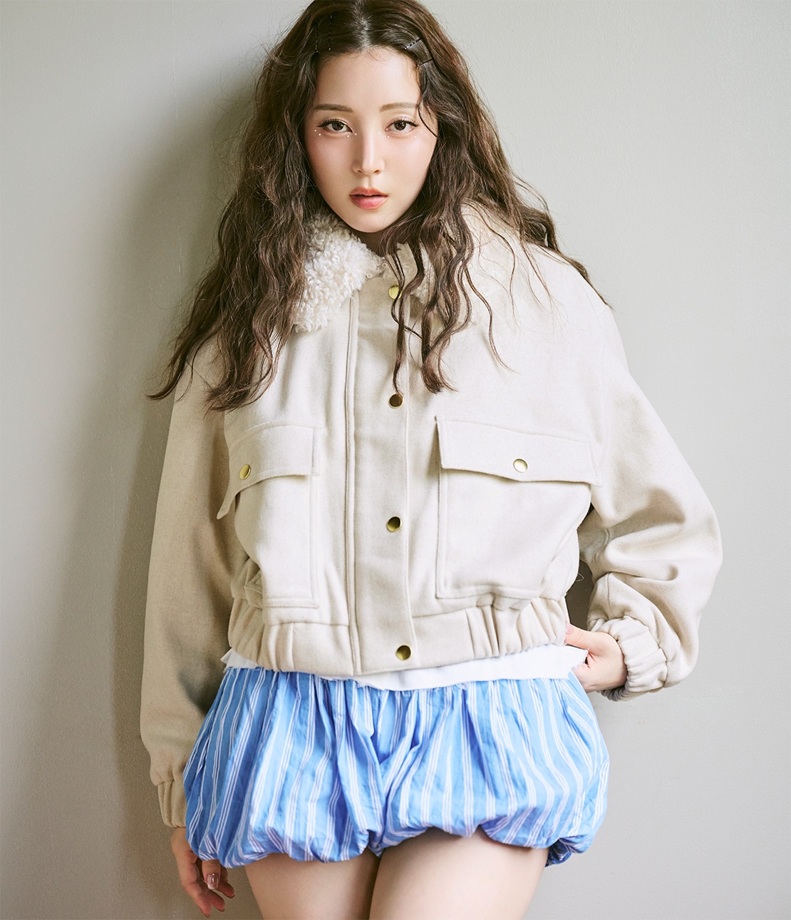 ・ショート丈なので重くならず、重心を引き上げて脚長バランスに見せる。