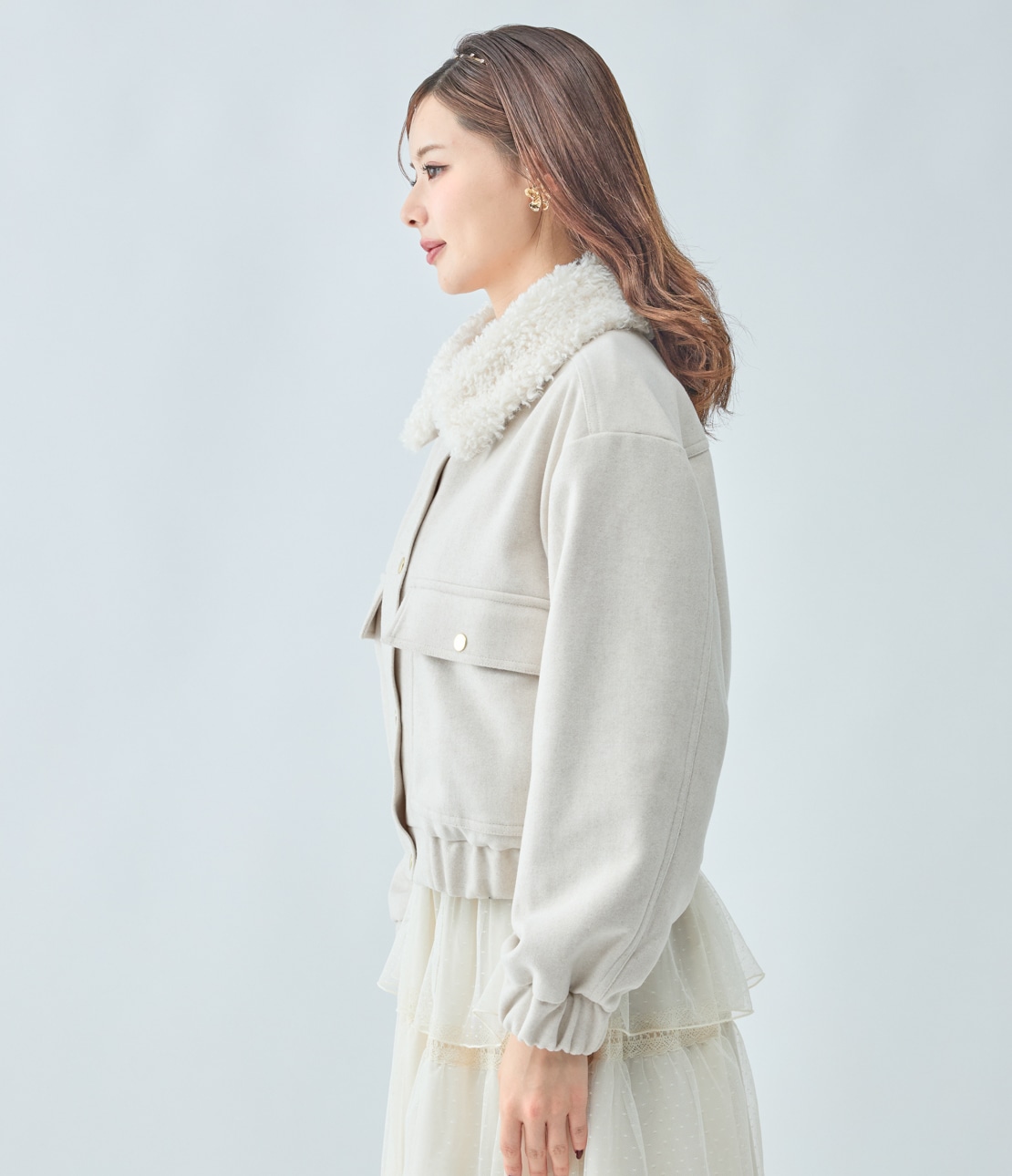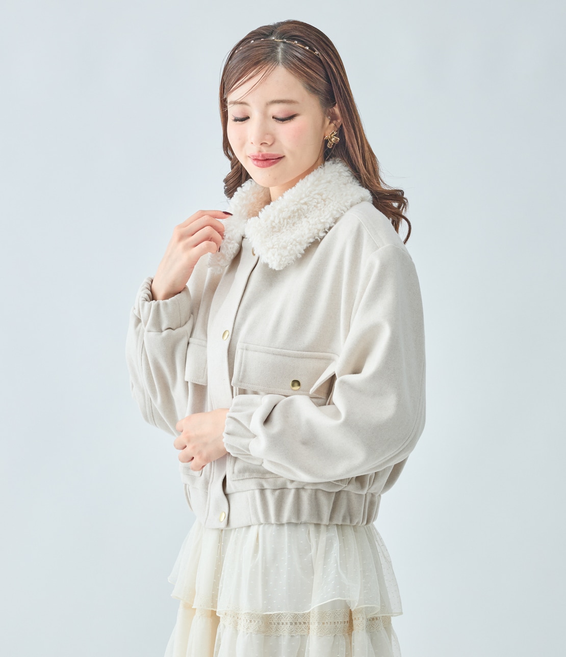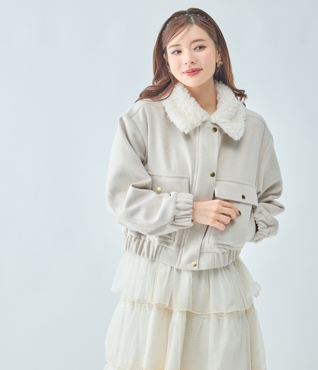 ・ボリュームたっぷりのファーカラーがキャッチーで、小顔効果も。