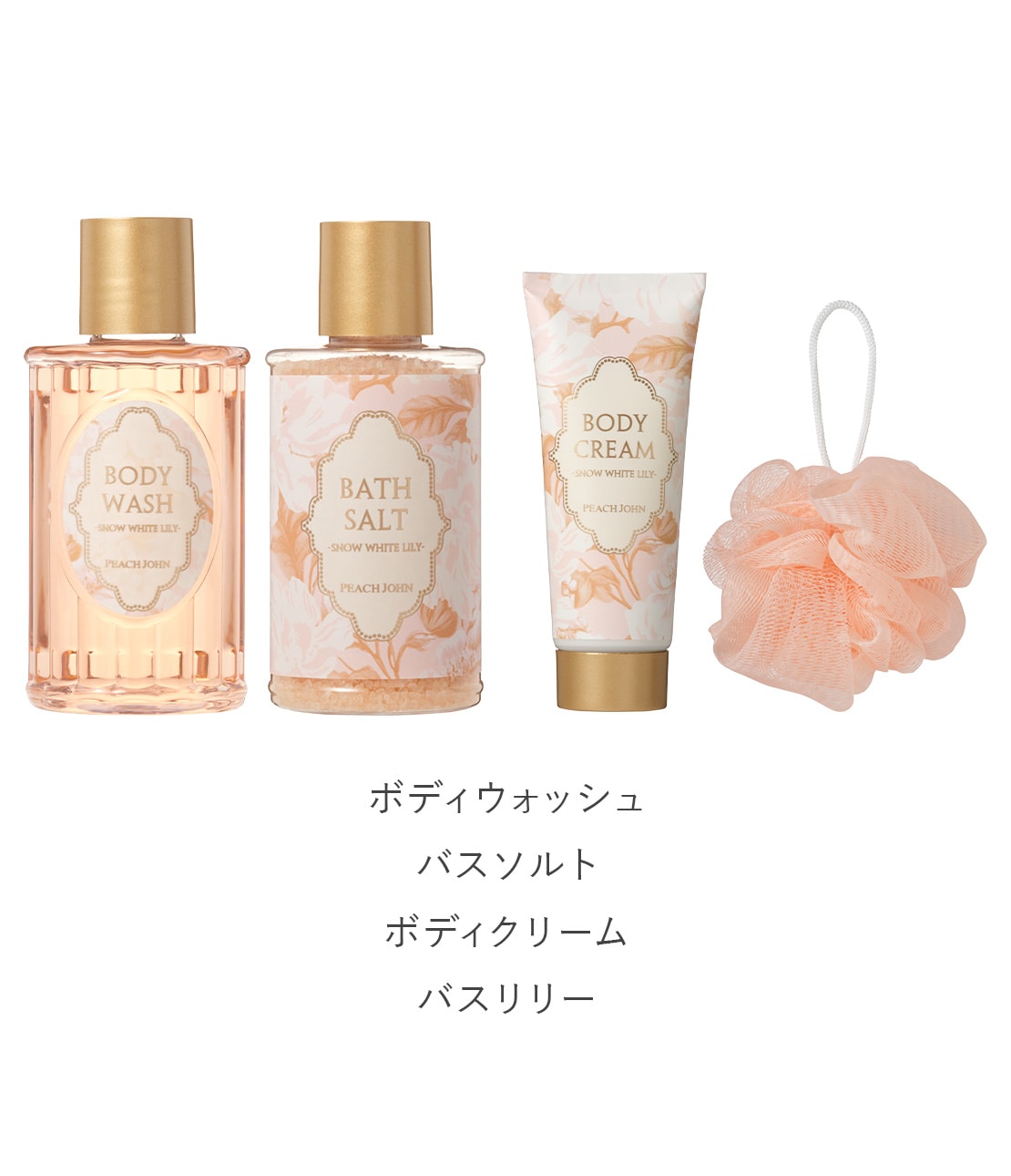 - ※セット内容:ボディウォッシュ(150ml)、バスソルト(180g)、ボディクリーム(100ml)、スポンジ