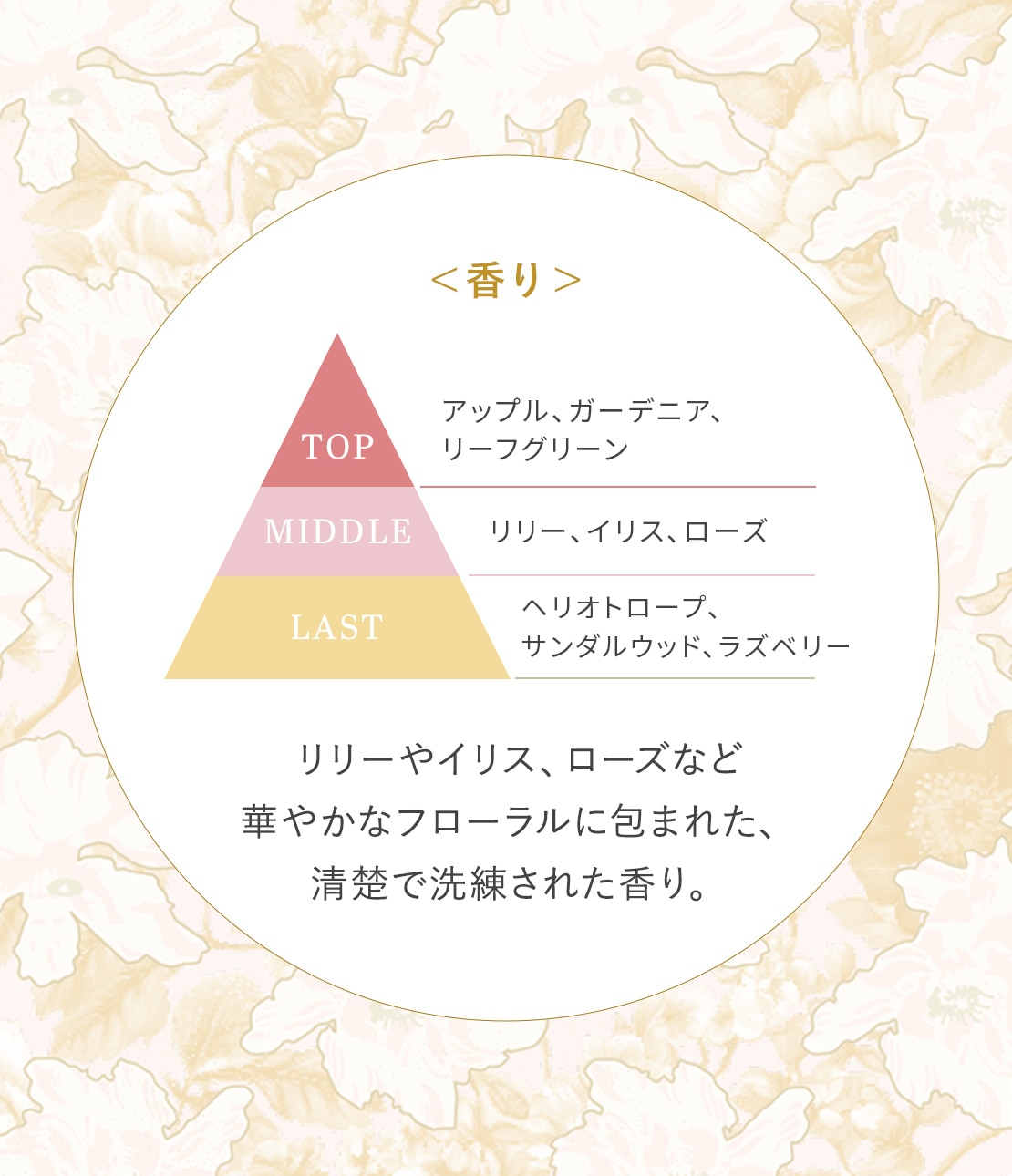 リリーやイリス、ローズなど華やかなフローラルに包まれた、清楚で洗練された香り。