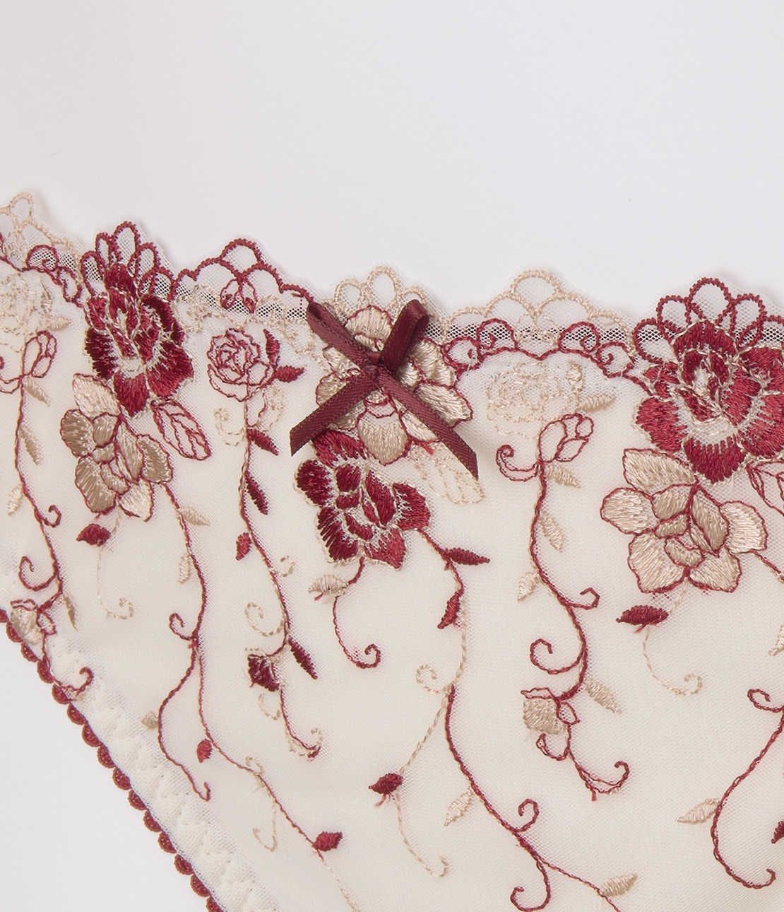 ・フロント下辺はやや長めにレースをあしらって豪華見え。センターにはリボン付きのスリットを入れて抜け感を演出