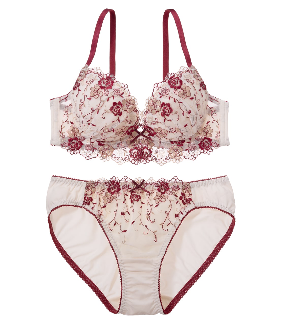 きれいな谷間に、キュートな刺しゅうのお花畑が満開!盛りブラ&ショーツのセット。