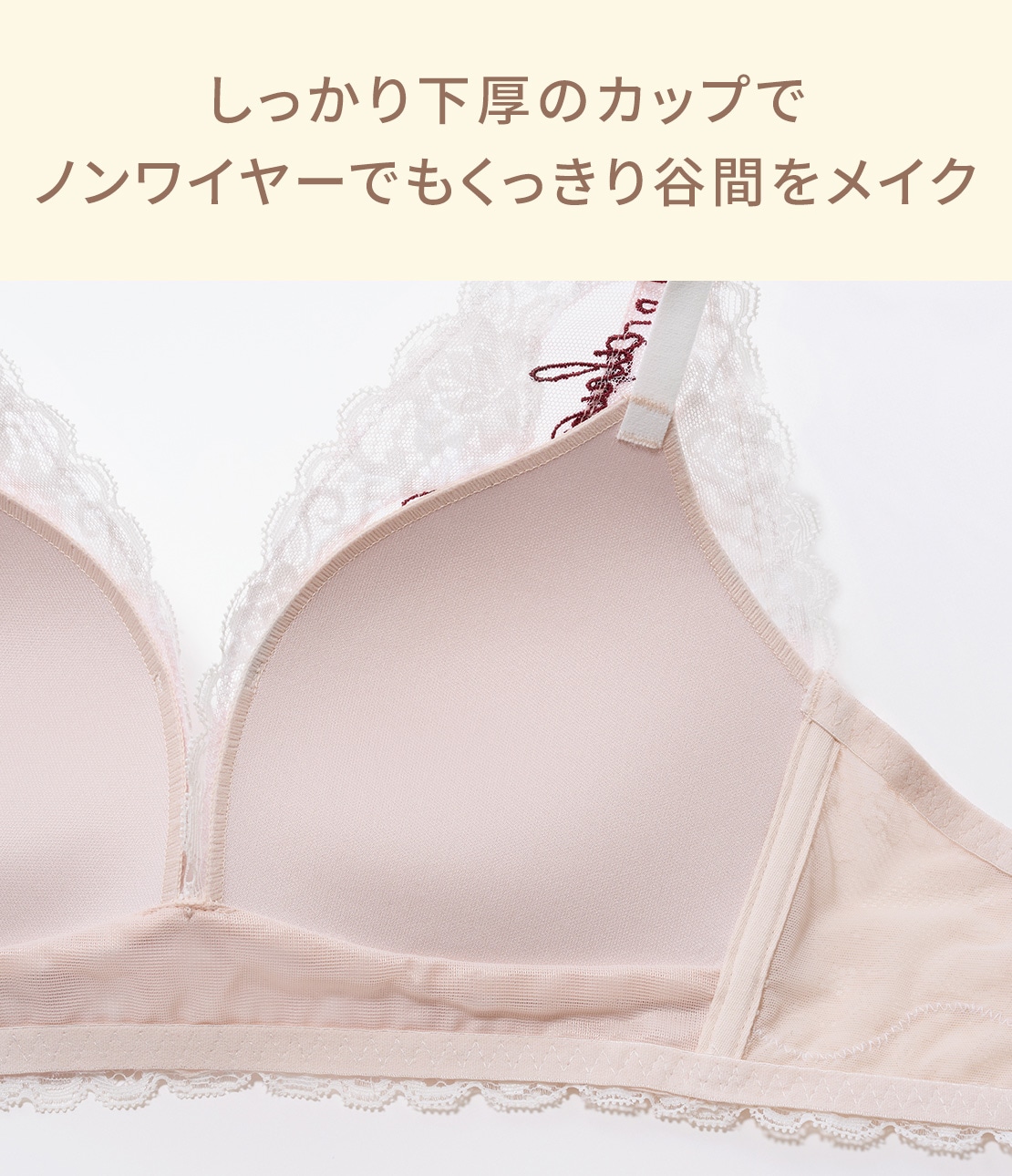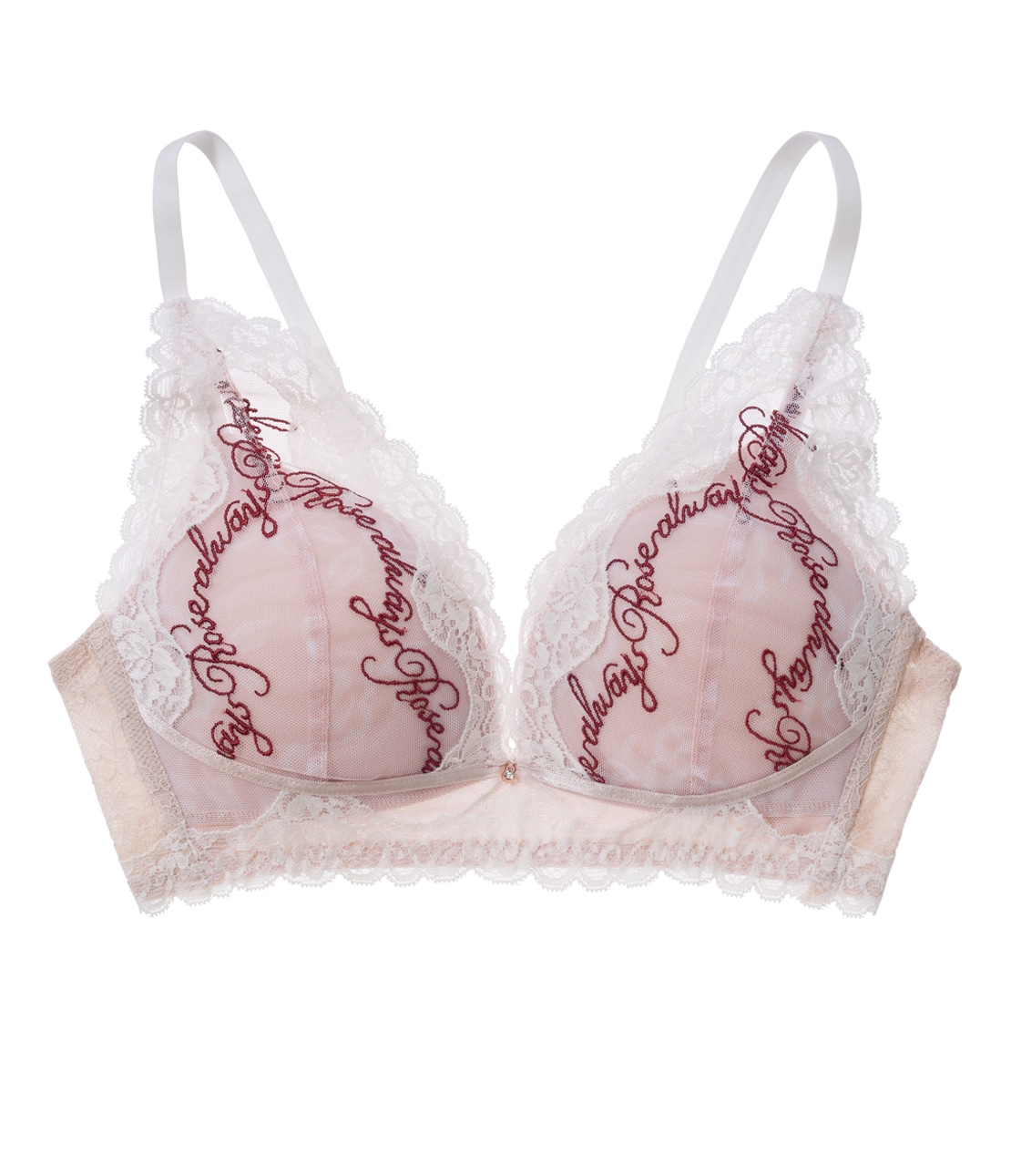 バラ柄&メッセージ刺しゅうに心ときめく!しっかり盛れるノンワイヤーブラ。