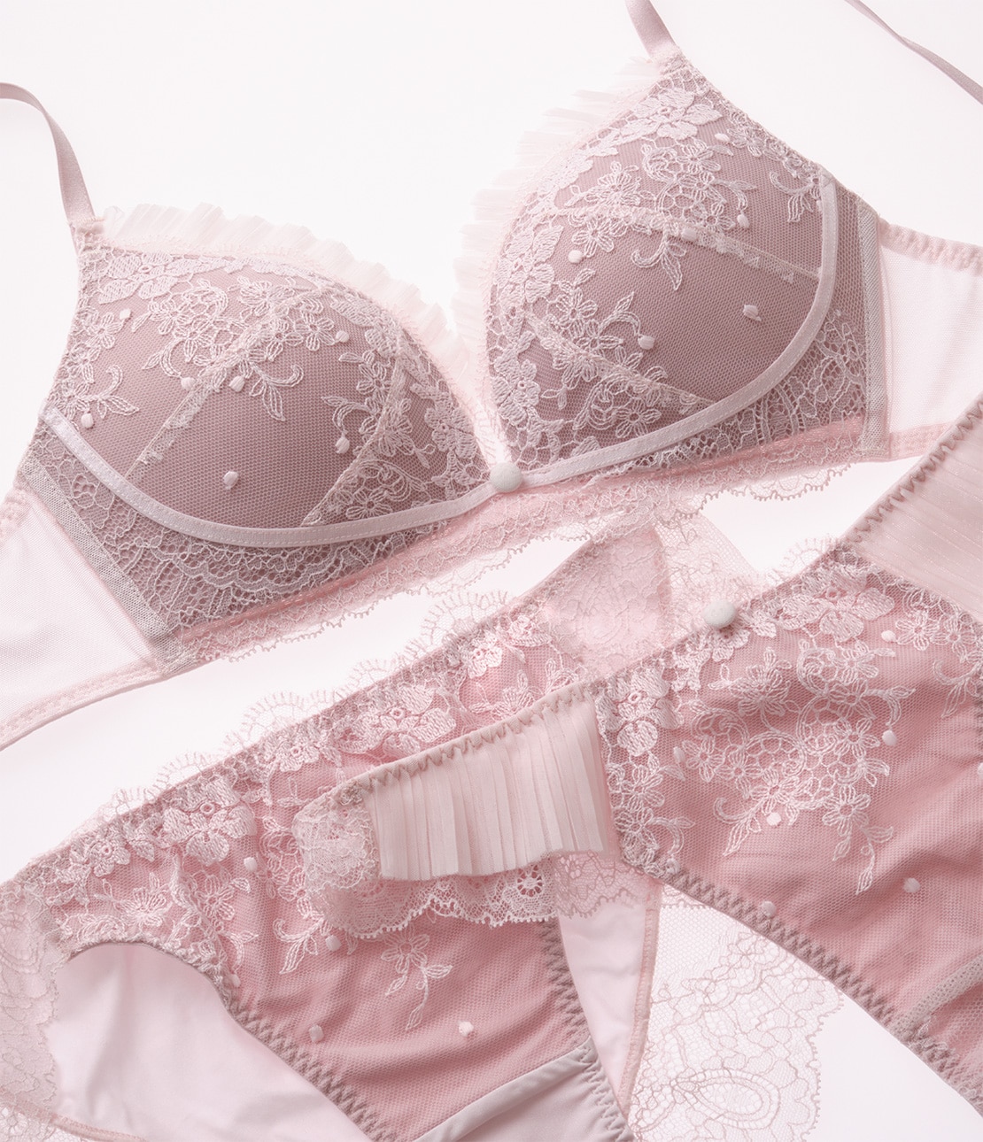 ・大人っぽく繊細な柄行きの刺しゅうレースをカップに使用。ライニングは配色で、レースの美しさを引き立てる