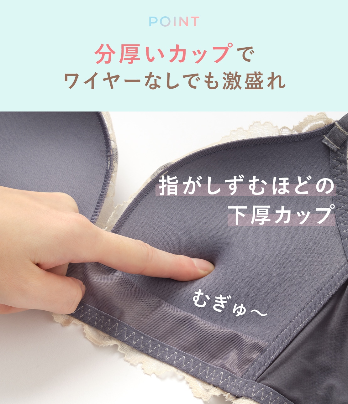 ・サイド~下側が分厚いカップでボリュームをプラスしながら寄せ上げ、くっきり谷間をメイク。