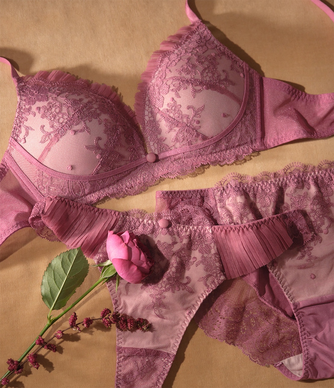 ・大人っぽく繊細な柄行きの刺しゅうレースをカップに使用。ライニングは配色で、レースの美しさを引き立てる