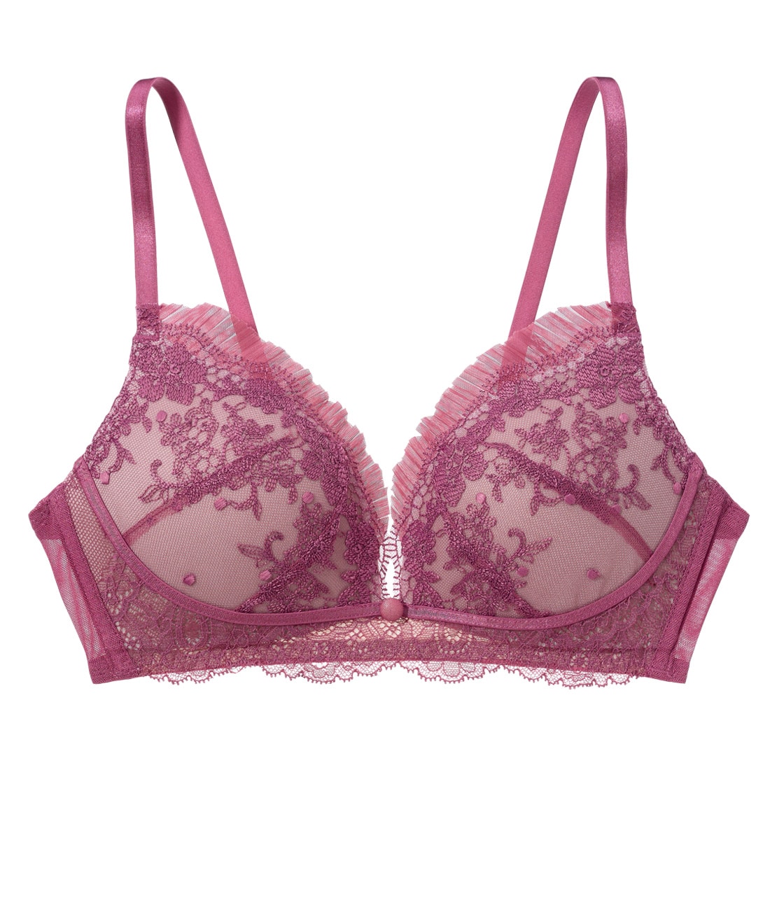 ・フロント下部はストレッチレースに切り替え、ワイヤー風の細幅テープをあしらって全体を引き締め。バストがきゅっと中央に寄って見える効果も