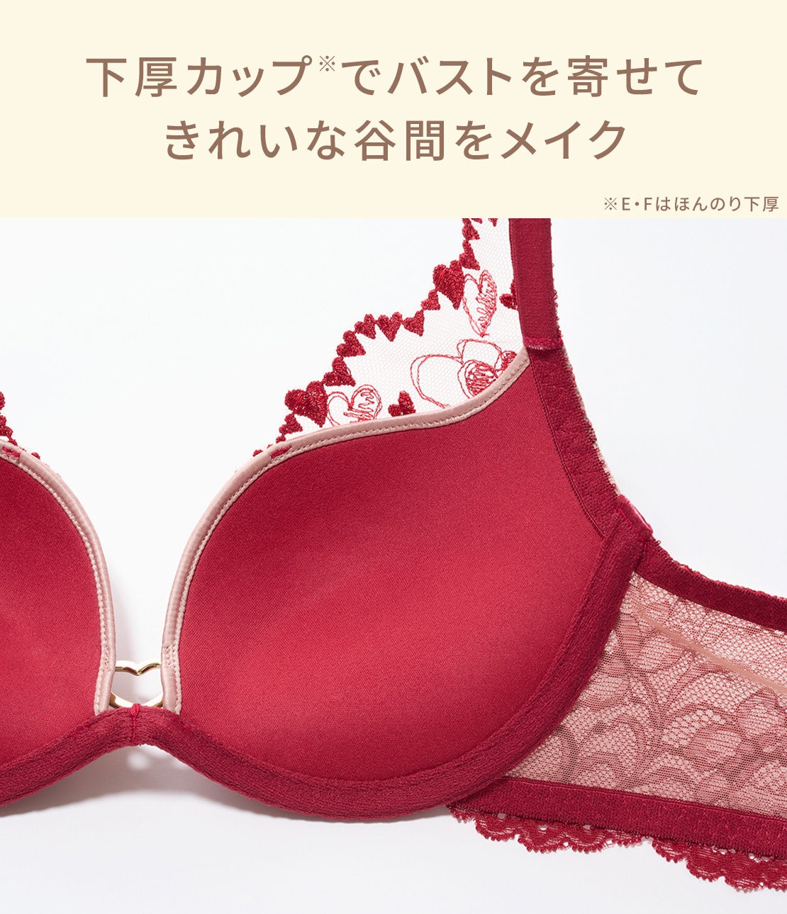 ・斜め下側に厚みをつけた下厚カップ※でバストをやさしく寄せ上げ、作り込みすぎないきれいな丸みの谷間をメイク。(※E・Fカップはほんのり下厚カップ)