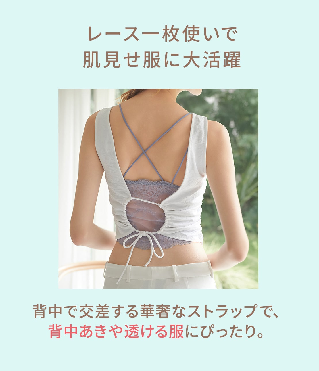 ・ストラップは華奢なマカロニテープ2本使いで、背中で一組がクロス。背中あきの服からのぞかせても、映えるデザイン
