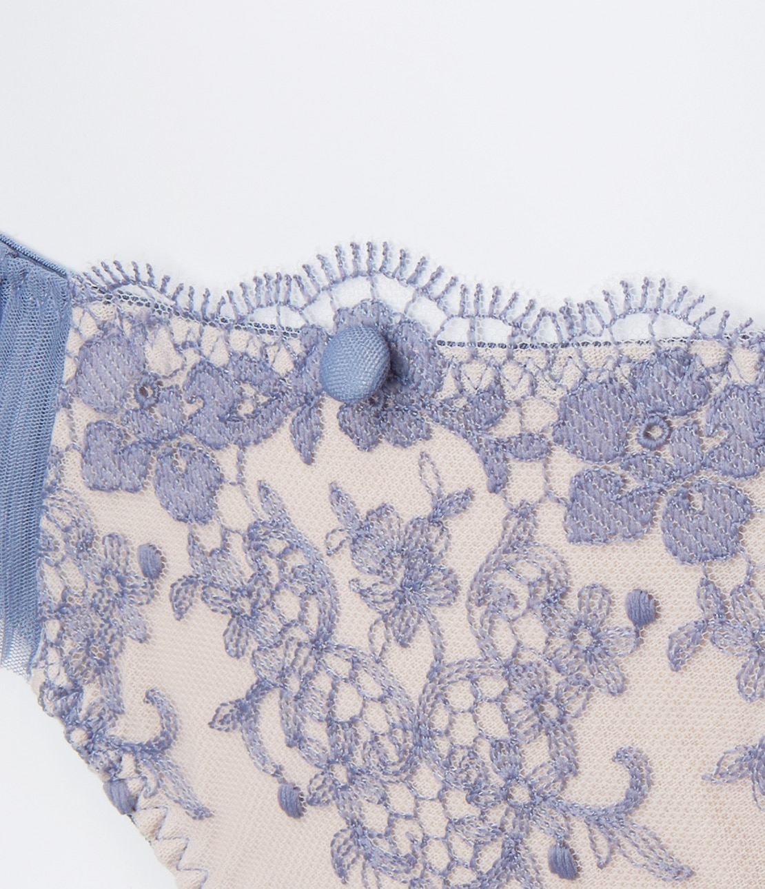 ・ウエスト中央に、ブラとおそろいのくるみボタンがフェミニンなアクセント。
