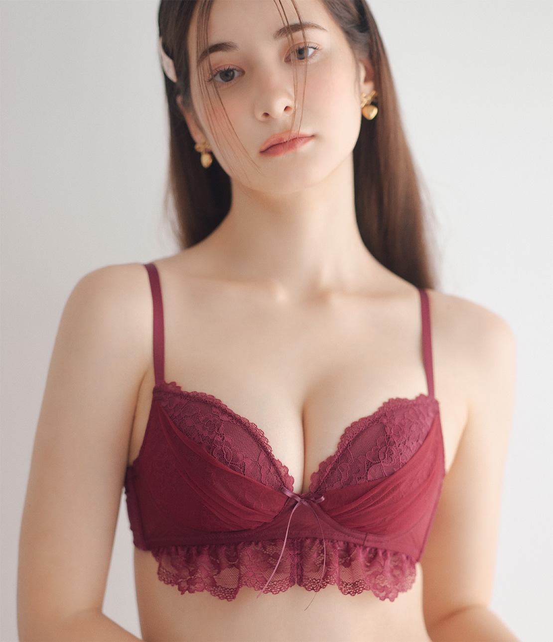 ・レースのカップに透けるチュールを重ねることで、大人っぽくフェミニンな表情に。