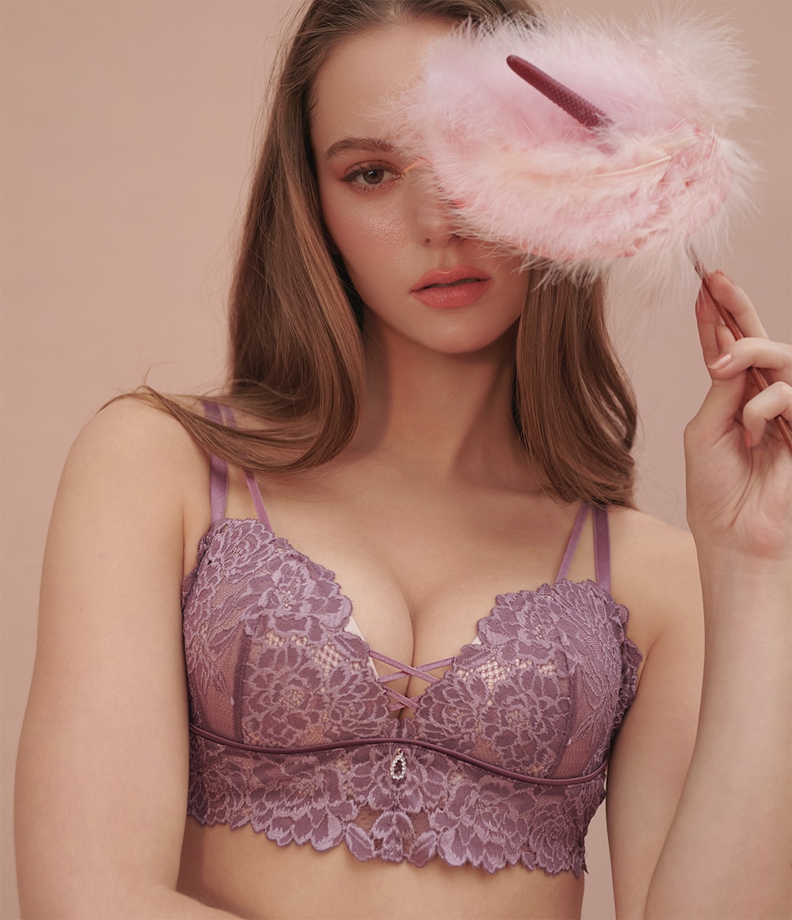 ・カップ間を編み上げ風にクロスしたテープでつなぎ、谷間をセクシーに演出