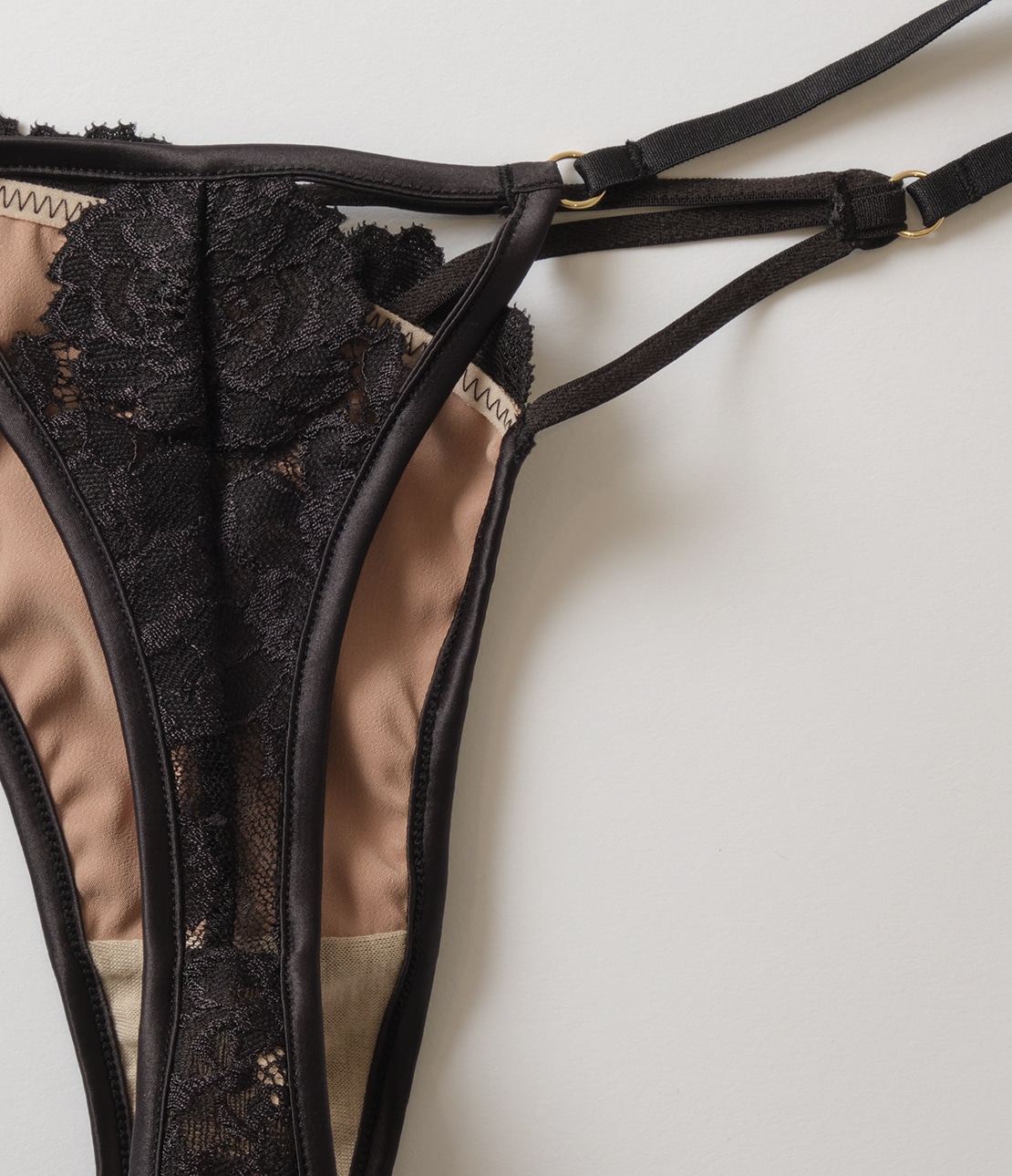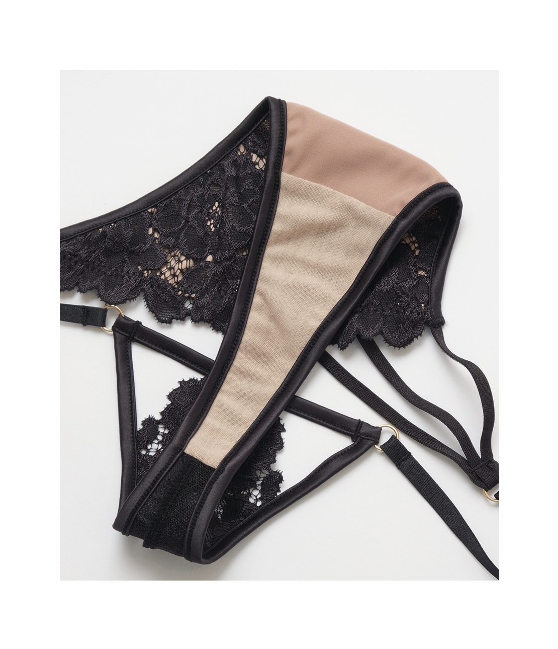・ストレッチレースを斜めに使い、右サイドに3本のストリングを配した、大胆でインポートライクなデザイン。