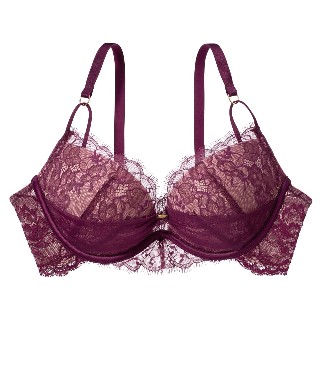 ・ワイヤー部にサテンテープをあしらい、カップ間にロゴ入りゴールドプレートをプラス