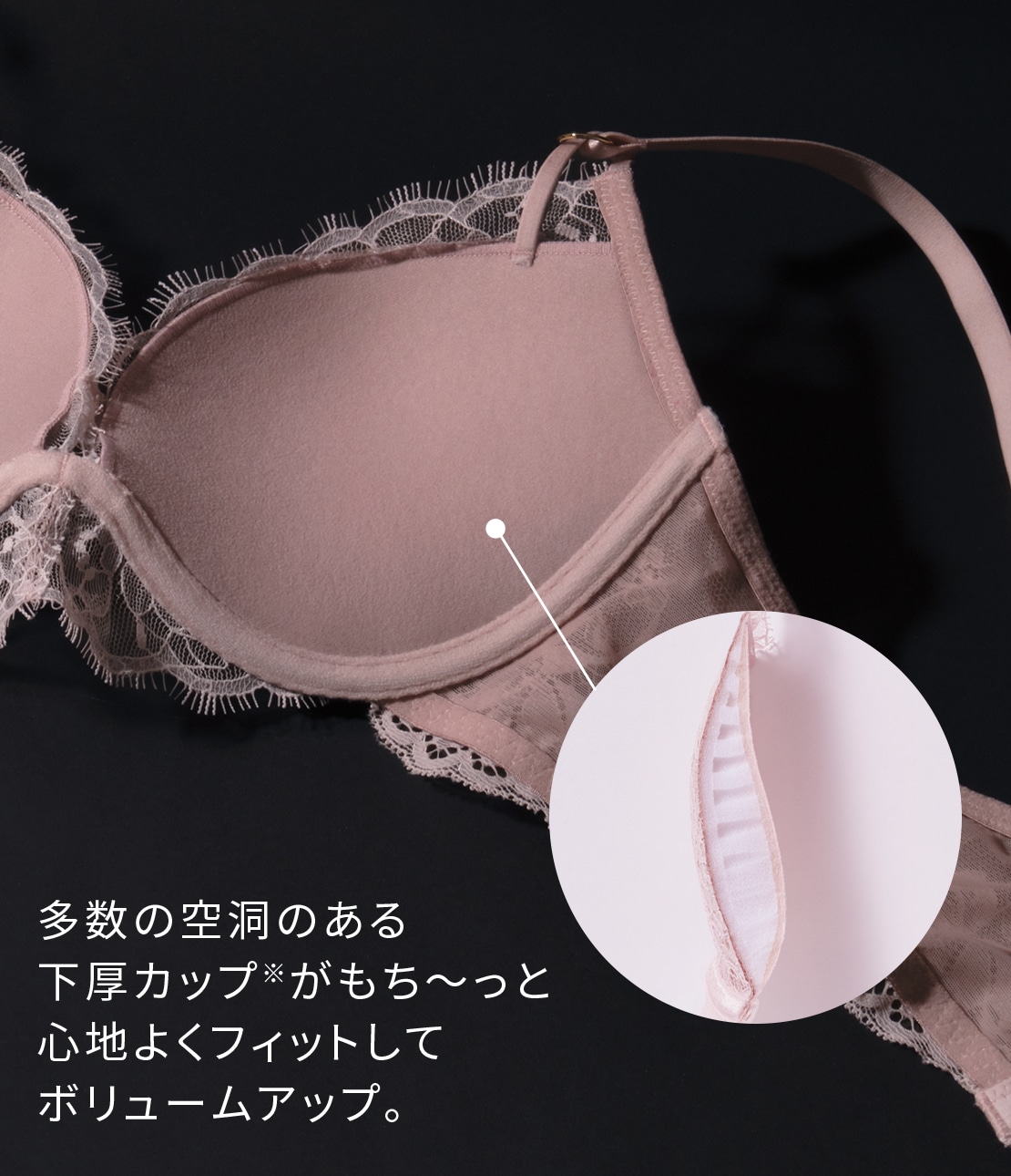 ・内部に多数の空洞があるため軽く、柔らかな下厚カップ※がもち~っと心地よくフィット。