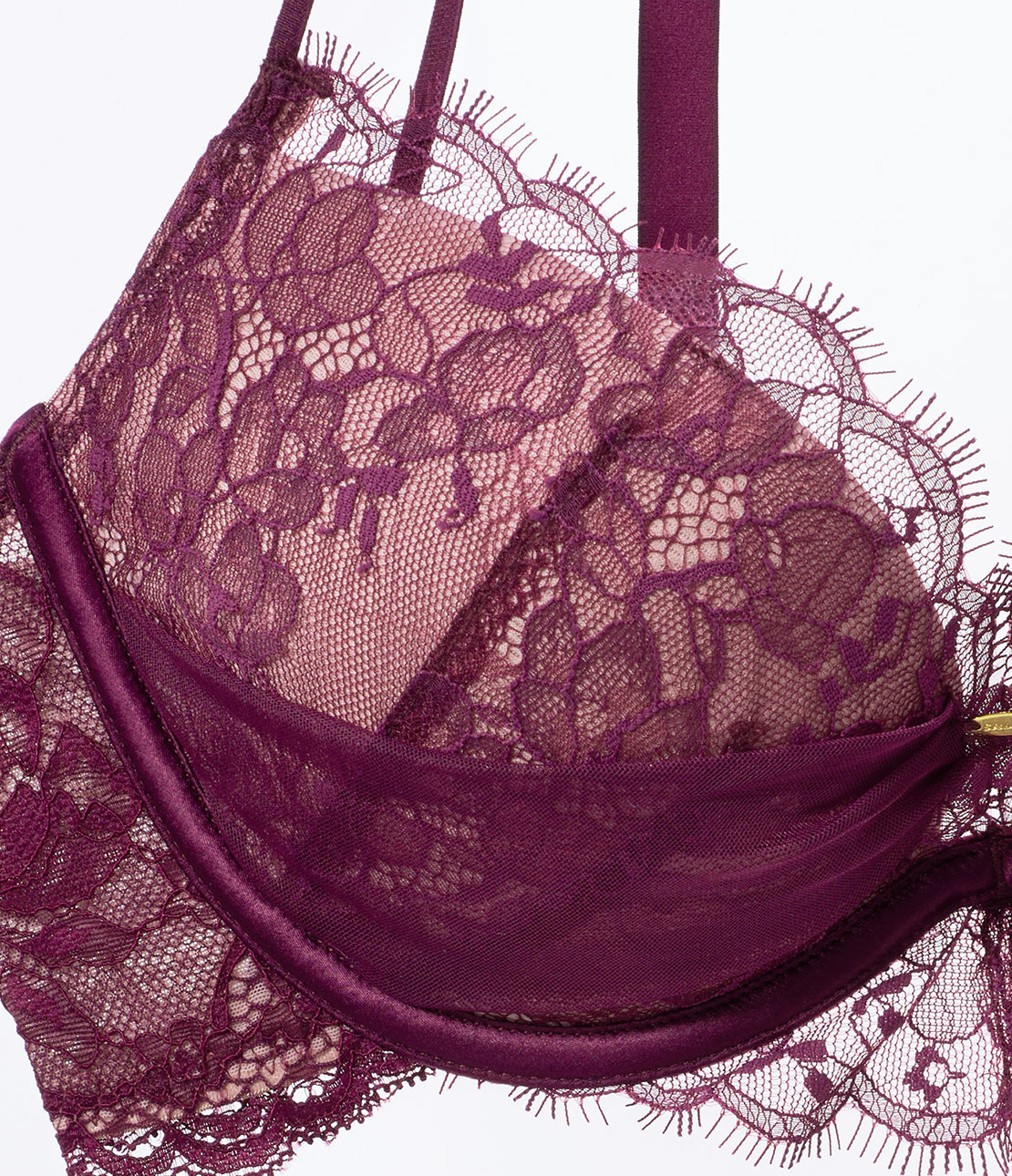 ・カップ下部にチュールのヴェールをかぶせて、フェミニンなニュアンス