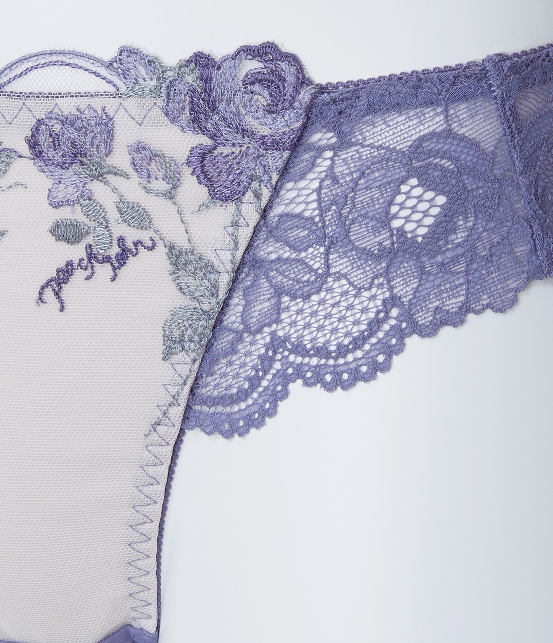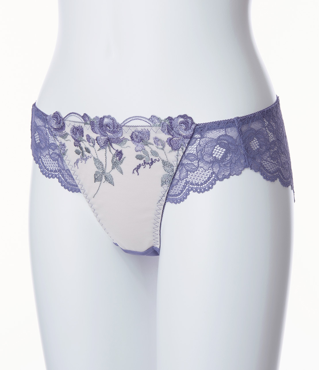 ・ローズとPeach Johnのロゴを組み合わせた華やかな刺しゅうレースに、薄手の生地を裏打ち。レースの柄が引き立ち、肌が透けにくい。