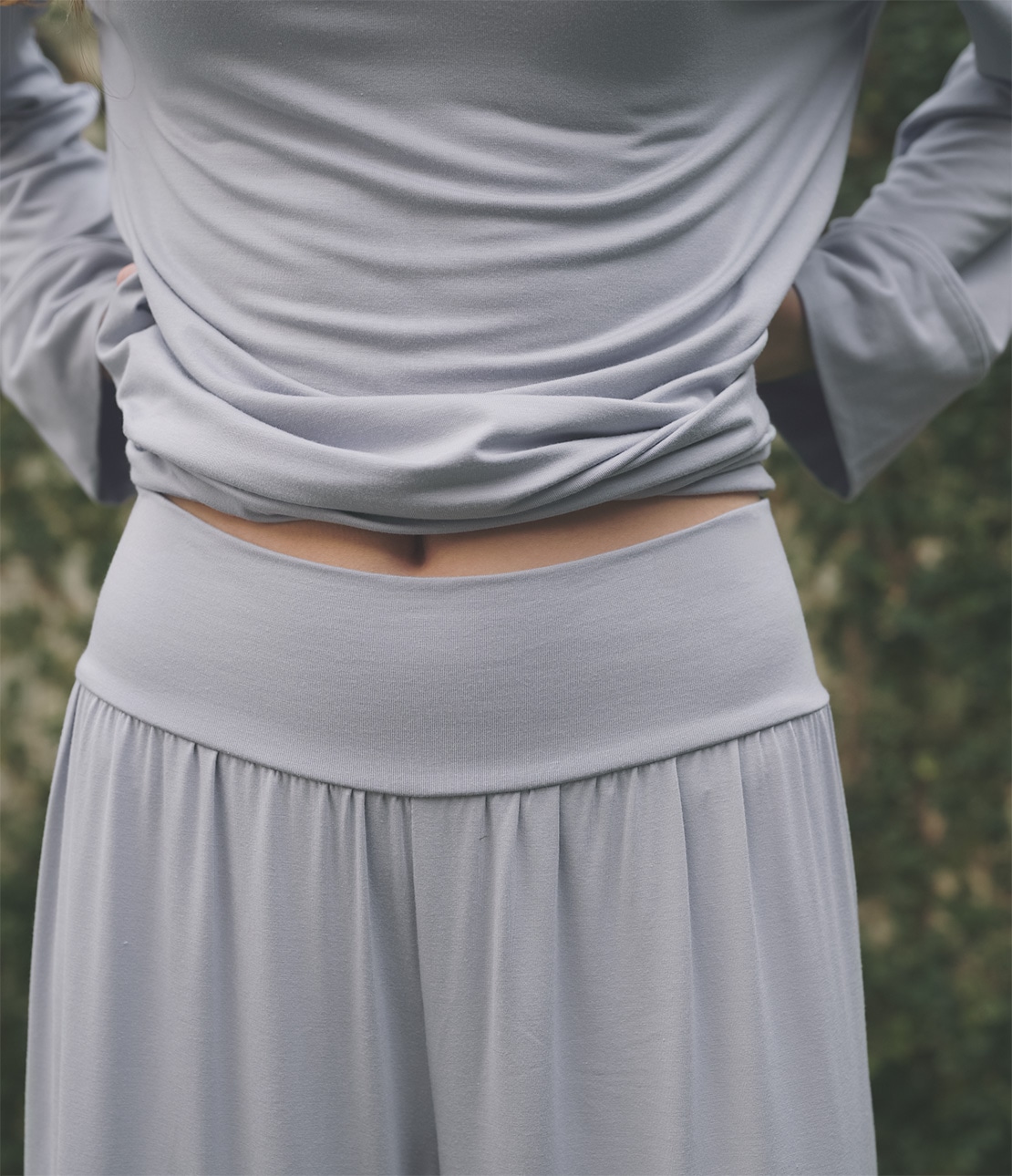 ・ウエストは折り返した二重の身生地に切り替え。ゴムを使わず、ストレッチ生地の自然な伸縮性でやさしくフィット