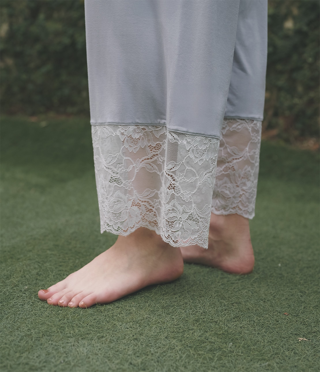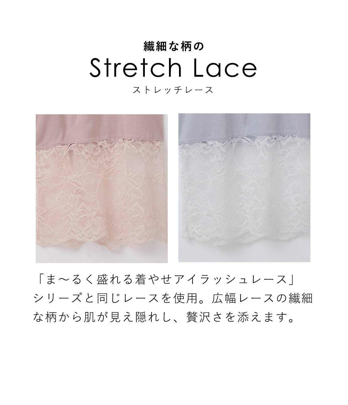 ・裾一周を幅広のストレッチレースに切り替えてラグジュアリー。肌がほんのり透ける