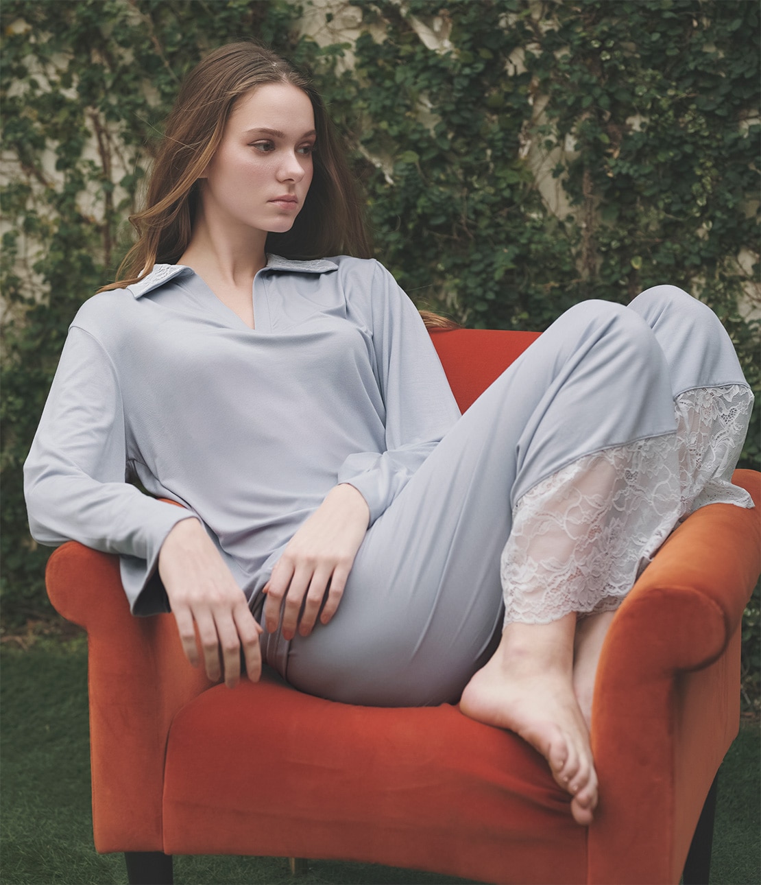 ・トップスの襟と、ボトムスの裾にストレッチレースをあしらったエレガントなパジャマ。